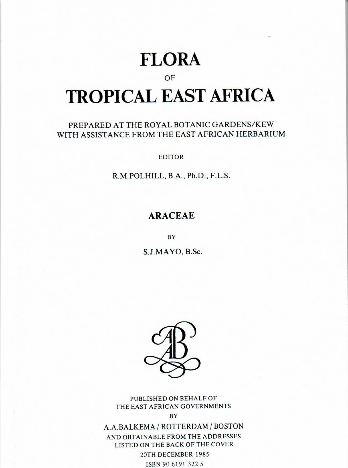 Flora of Tropical East Africa: Araceae by S. Mayo. 1985. illus. 71 p. gr8vo. Paper bd. (82841) 52.43