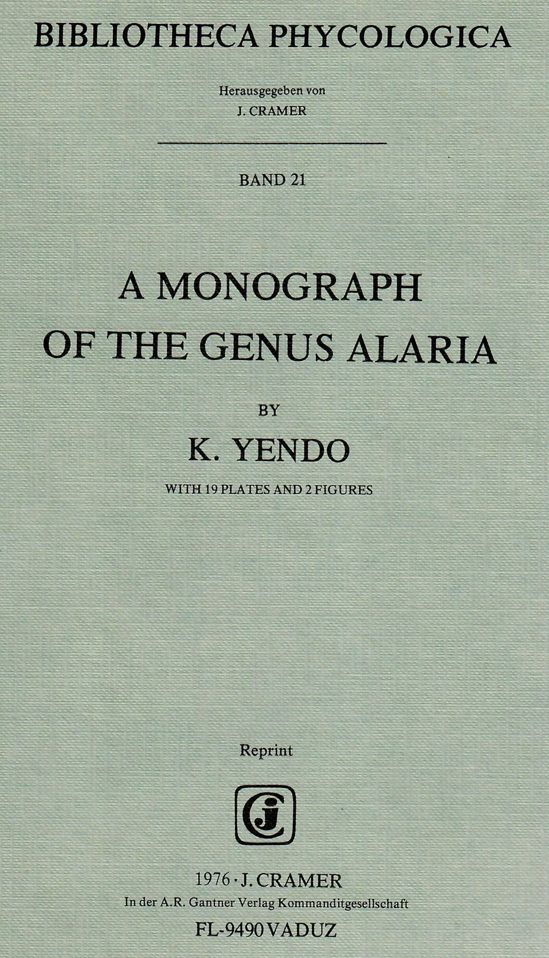 Volume 021: Yendo, K.: A Monograph of the genus Alaria. Tokyo 1919.(Jl.Coll.Sc.Imperial Ac.Univ.,43). (Reprint 1976) 19 plates. II, 186 p. gr8vo. Paper bd. (ISBN 978-3-7682-1066-9)
