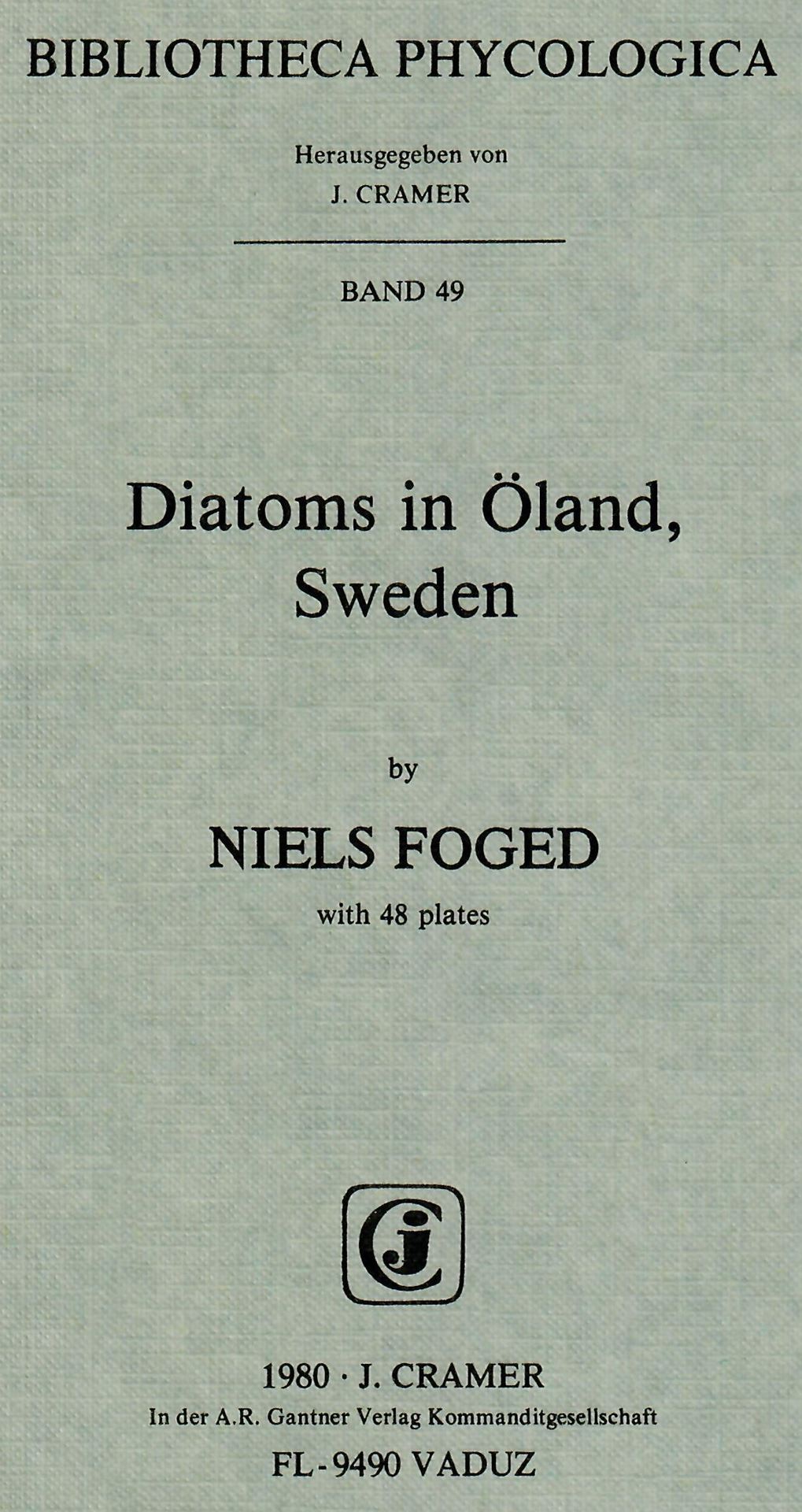 Foged, Niels: Diatoms in Oeland,Sweden.1980.(Bibl.Phycolog.49). 48 pls. 2 maps.II,194 p.gr8vo.Paper bd.(18704) 26.00 (ISBN 978-3-7682-1269-4)