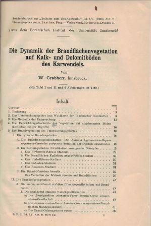 Grabherr, W.: Die Dynamik der Brandflächenvegetation auf Kalk- und Dolomitböden des Karwendels. 1936. (Beih. zum Bot. Centralblatt, LV). 2 Tafeln. 94 S. gr8vo. Kartonniert. (86894) 29.96