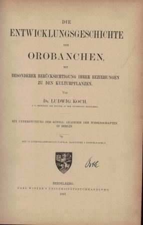 Koch, Ludwig: Die Entwicklungsgeschichte der Orobanchen, mit besonderer Beruecksichtigung ihrer Beziehungen zu den Kulturpflanzen.1887.6 Taf. V,389 S.4to.Halbleinen. - Stempel d.Verf.auf Vorsatz.(53062) 128.00