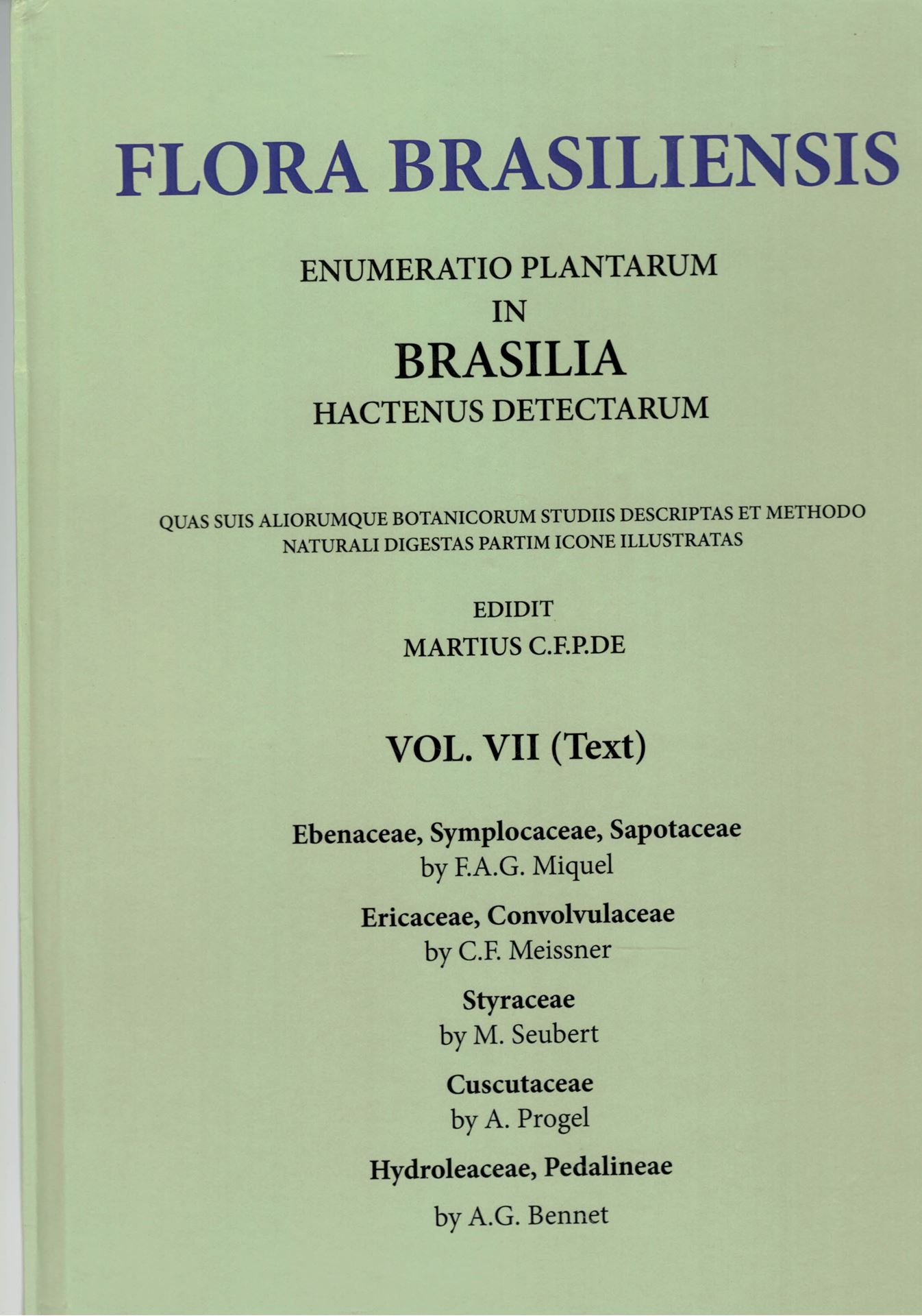 Flora Brasiliensis: Ed. by C.F.P. von Martius, A.G. Eichler & I.Urban: Volume 07: F.A.G.Miquel: Ebenaceae, Symplocaceae, Sapotaceae/ C.F. Meissner: Ericaceae, Convolvulaceae/ M.Seubert: Styraceae/ A. Progel: Cuscutaceae/ A.G.Bennet: Hydroleaceae, Pedalineae.1865-1871.(Reprint 2002). 131 plates. 424 p. Paper bd.(81526) 83.46
