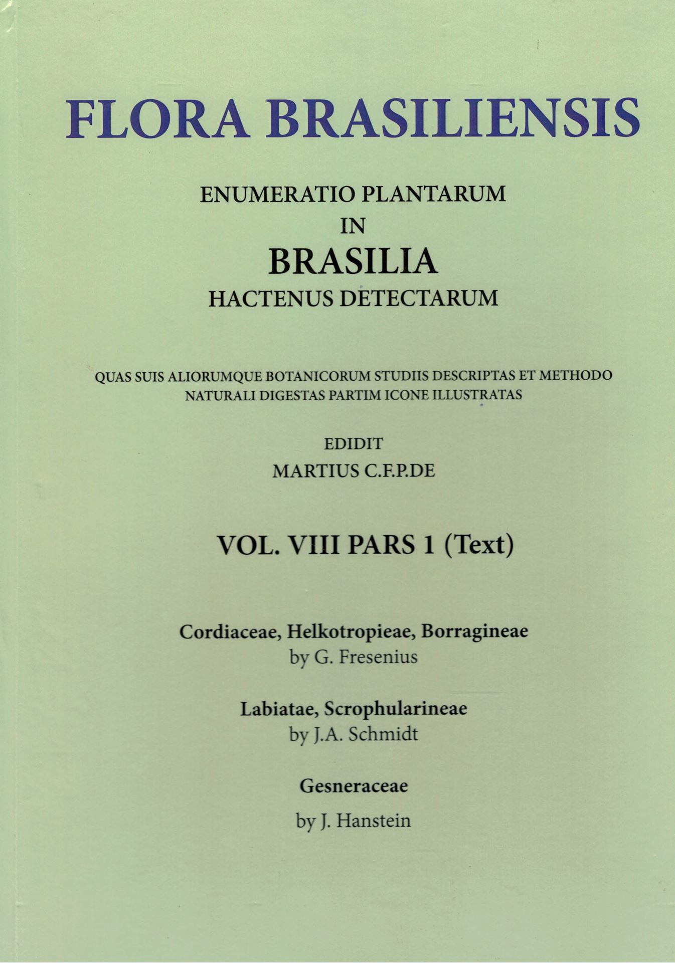Ed. by. C.F.P. von Martius, A.G.Eichler & I.Urban: Volume 08:01: G.Fresenius: Cordiaceae, Heliotropieae, Borragineae/ J.A. Schmidt: Labiatae, Scrophularineae/ J.Hanstein: Gesneraceae.1857-1886. (Reprint 2002). Plates 1-68. 448 p. Hardcover.