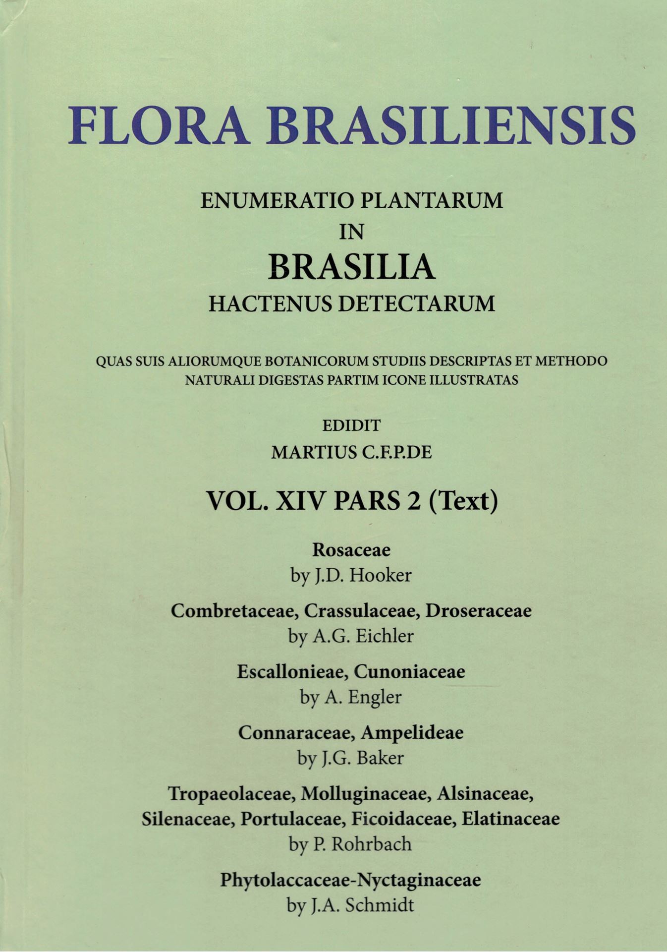 Flora Brasiliensis: Ed. by C.F.P. von Martius, A.G.Eichler & I.Urban: Volume 14:02: J.D.Hooker: Rosaceae/ A.G.Eichler: Combretaceae, Crassulaceae, Droseraceae/ A.Engler: Escallonieae, Cunoniaceae/ J.G. Baker: Connaraceae, Ampelideae/ P.Rohrbach: Tropaeolaceae, Molluginaceae, Alsinaceae, Silenaceae, Portulaceae, Ficoidaceae, Elatinaceae/ J.A.Schmidt: Phytolaccaceae-Nyctaginaceae. 1867-1872. (Reprint 2002). 91 plates. 418 p. Paper bd.(81540) 75.97