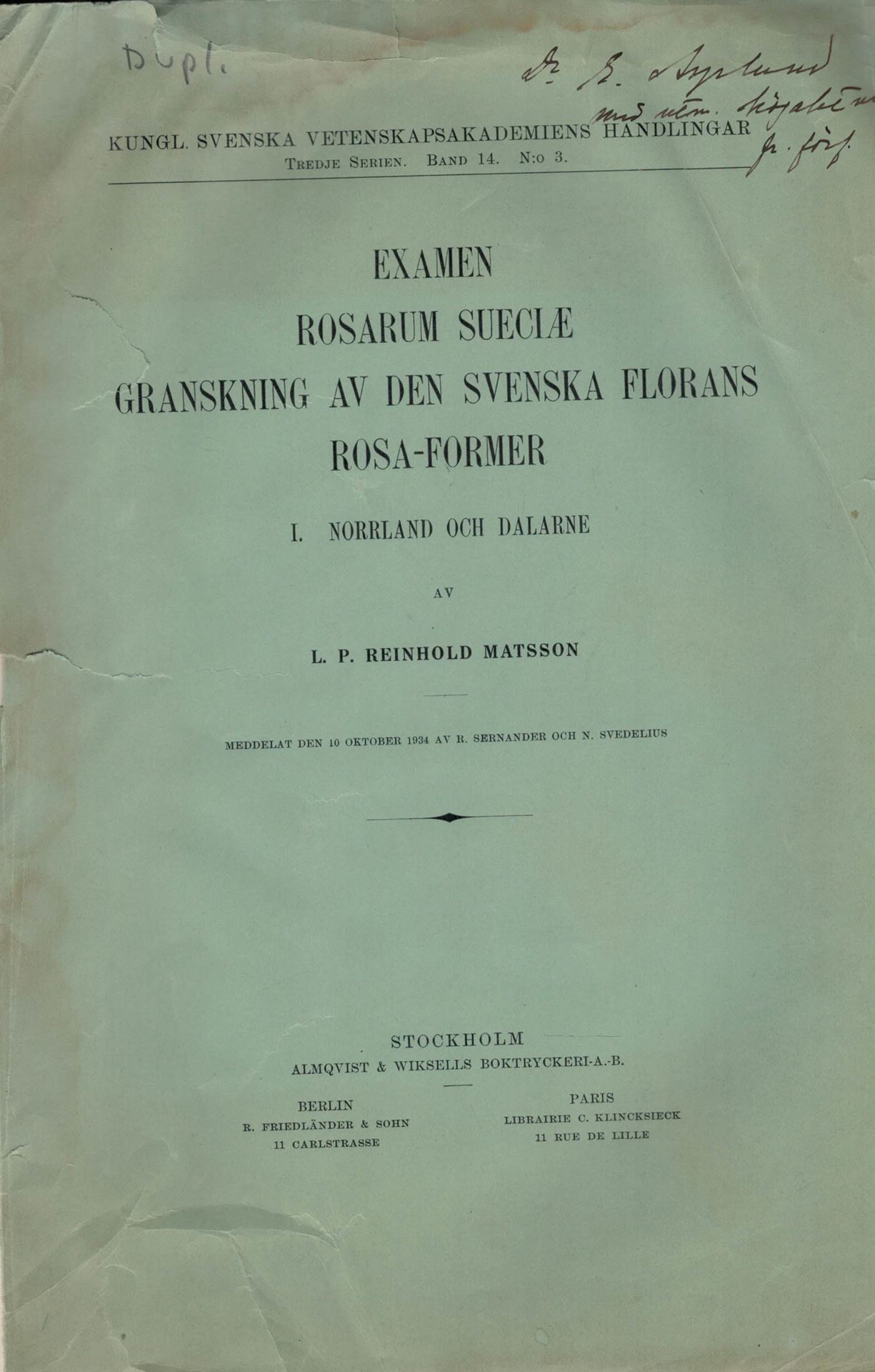 Matsson, L.P. Reinhold: Examen Rosarum Sueciae. Granskning av den Svenska Florans Rosa-Former. I: Norrland och Dalerne. 1934. (Kungl. Svenska Vetenskapsakademiens Handlingar, Tredje Serien, Band 14, No.3). 380 p. gr8vo. Paper bd.- In Swedish and Latin.(58874) 28.89