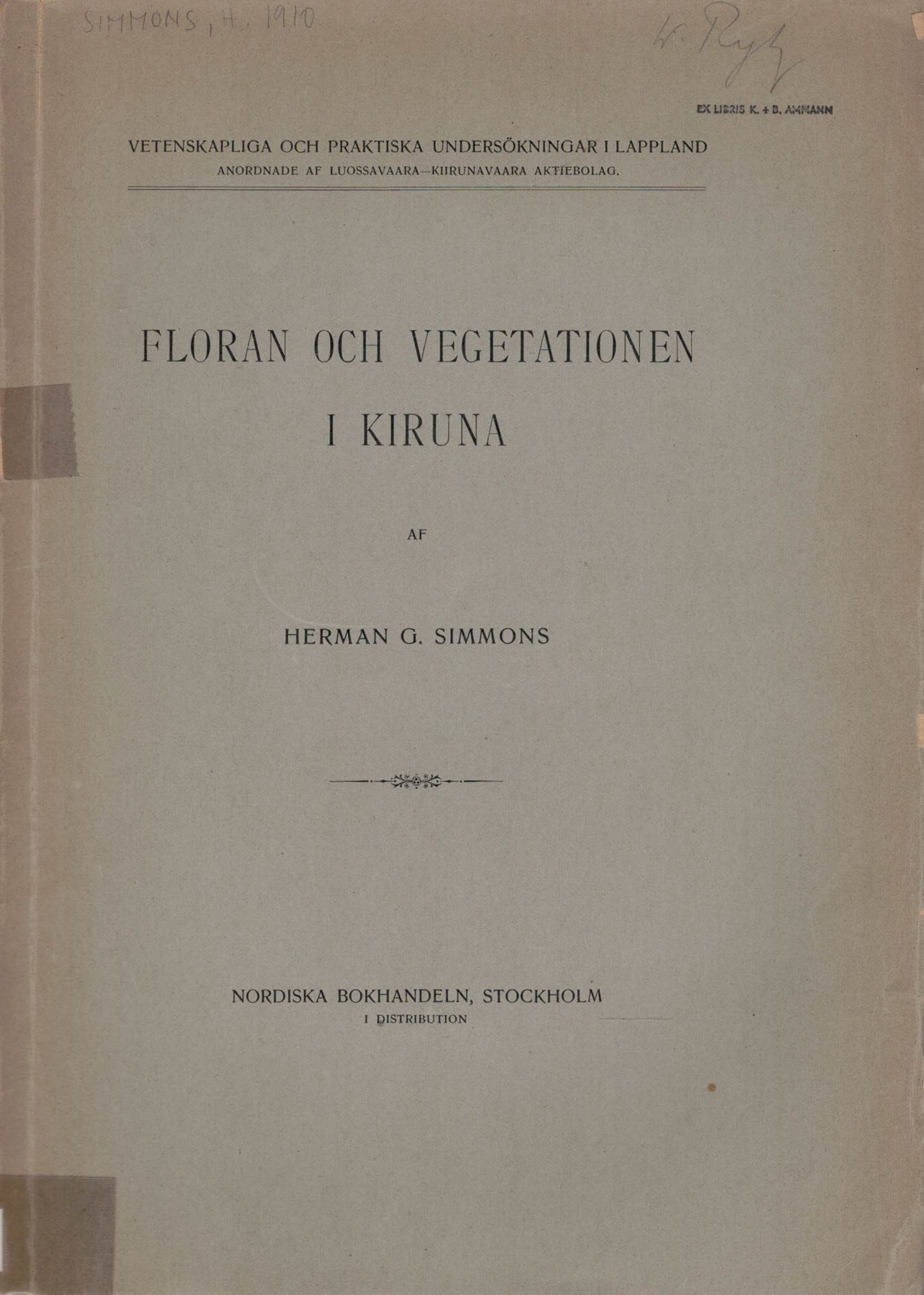 SIMMONS, Herman G.: Floran Och Vegetationen I Kiruna. 1910. 22 pl. IV tab. 1 folgd. distr.map. 400 p. Lex8vo. Paperbound.-In Swedish with Latin nomenclature.(46191) 20.33