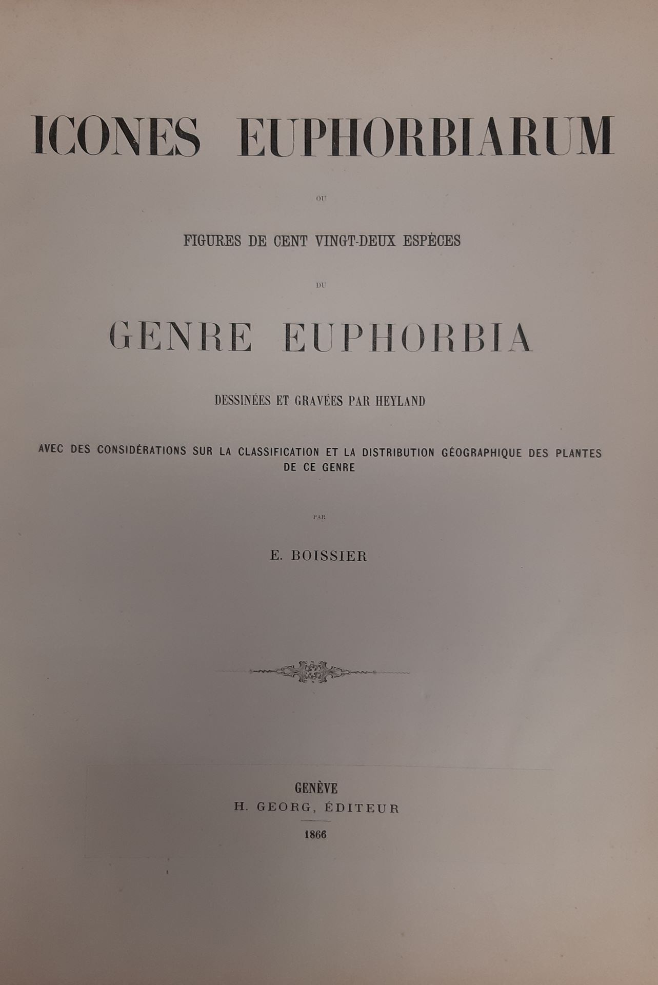 Icones Euphorbiarum ou figures de cent vingt-deux espèces du genre Euphorbia dessinnées et garvées par Heyland avec des considérations sur la classification et la distrubution géographique des plantes de ce genre. 1866. 120 plates & 2 bis.numbered plates. 24 p. Folio. Halfleather.