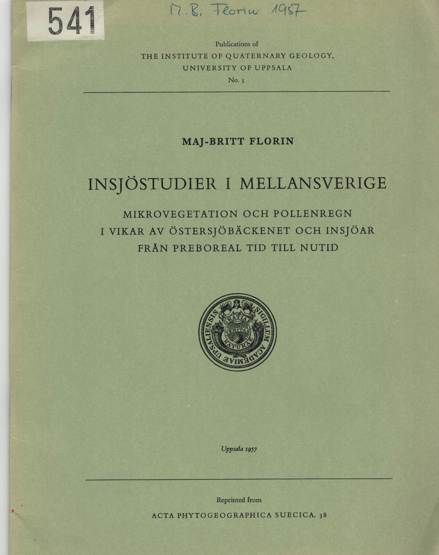 Florin,Maj-Britt: Insjoestudier i Mellansverige.Mikrovegetation och Pollenregn i Vikar av Oestersjoebaeckenet och Insjoear fran Preboreal Tid till Nutid.1957.(Acta Phytogeogr.Suecica,38).Illus.39 p. 22.47 (23590)