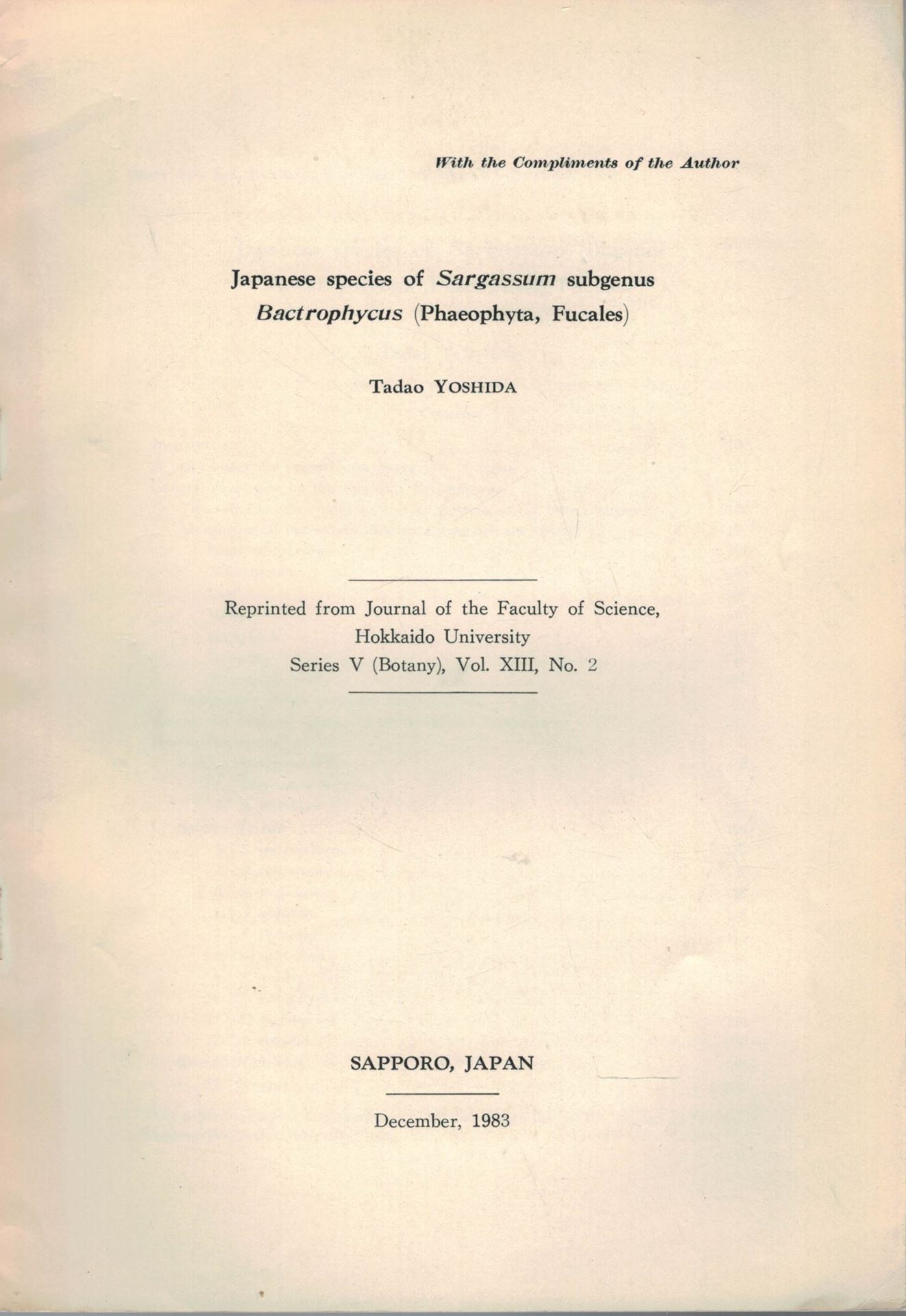 Yoshida,Tadao:Japanese species of Saragassum subgenus Bactrophycus (Phaeophyta,Fucales).1983.(Jl.of the Fac.of Science,Hokkaido University,series V,Botany,Vol.XIII,No.2).99 figs.148 p. gr8vo.Paper bd. In Eng-lish.(361) 17.12