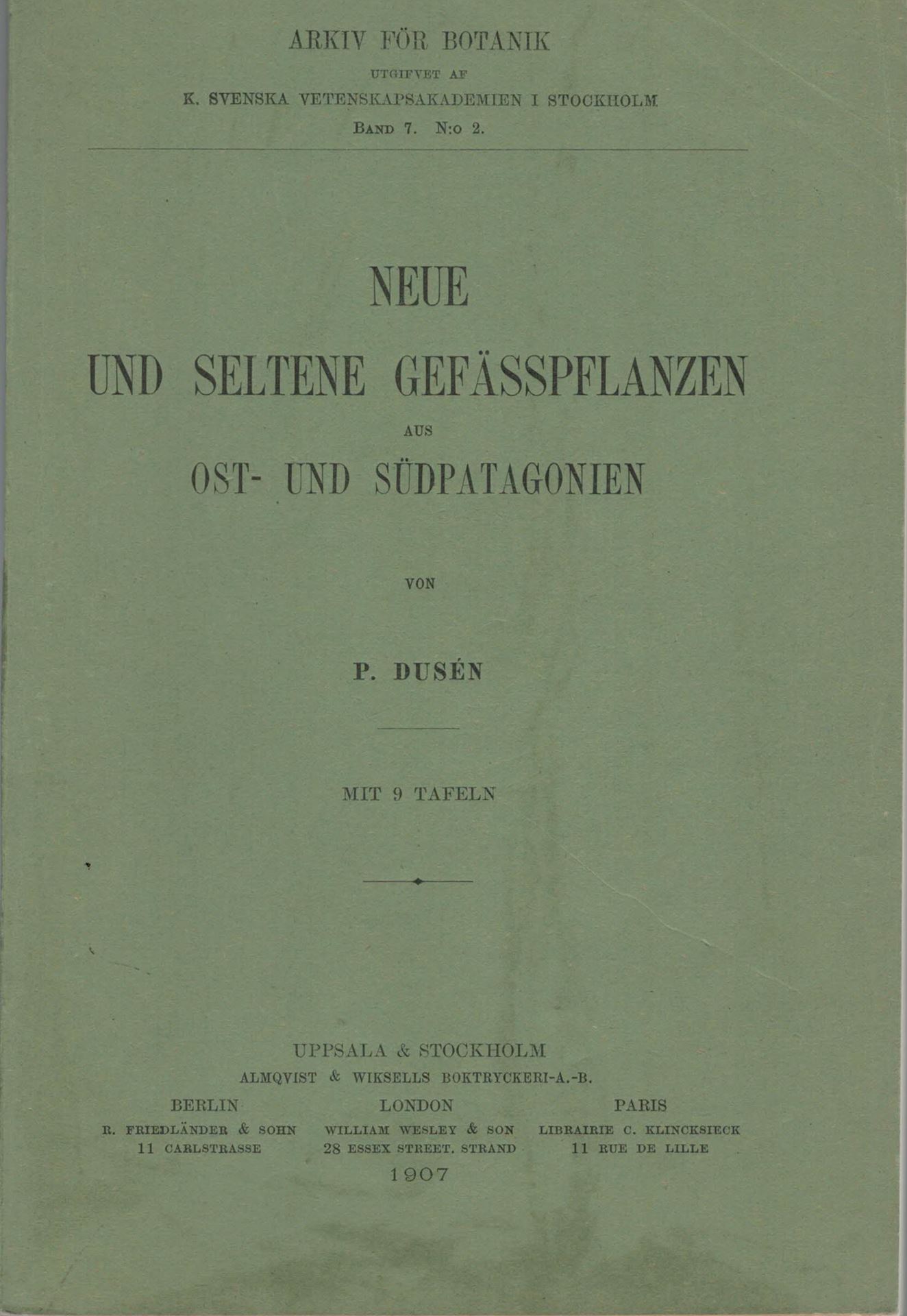 Dusen, P.: Neue und seltene Gefässpflanzen aus Ost- und Südpatagonien. 1907. (Arkiv för Botanik, Band 7, No.2). 9 Tafeln. 62 S. gr8vo. Broschiert.(83411) 19.26