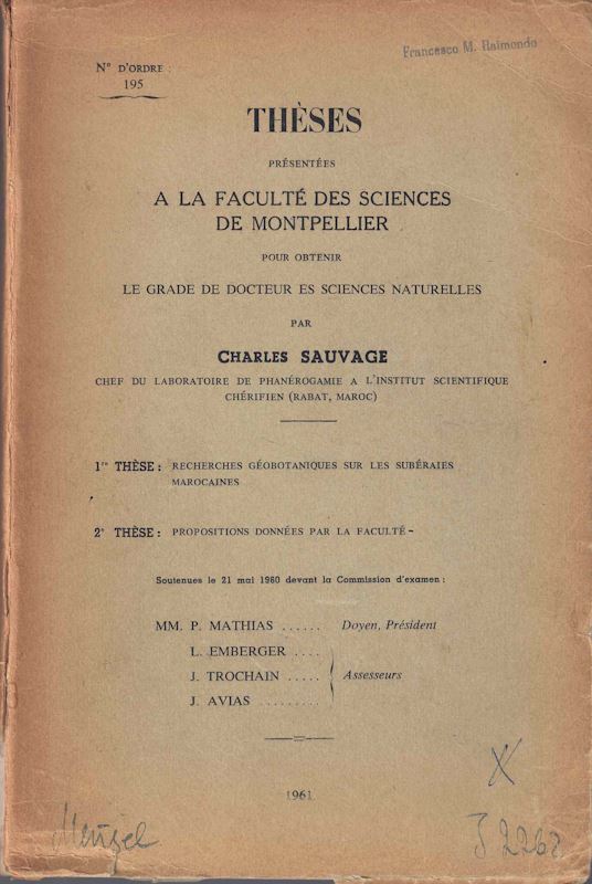 Recherches Gébotaniques sur les Suberaies Moricaines. 1961. 14 photogr. 462 p. - (Bound with): Annexe: Flore des Subéraies Marocaines.. 1960. 252 p. gr8vo. Paper bd.