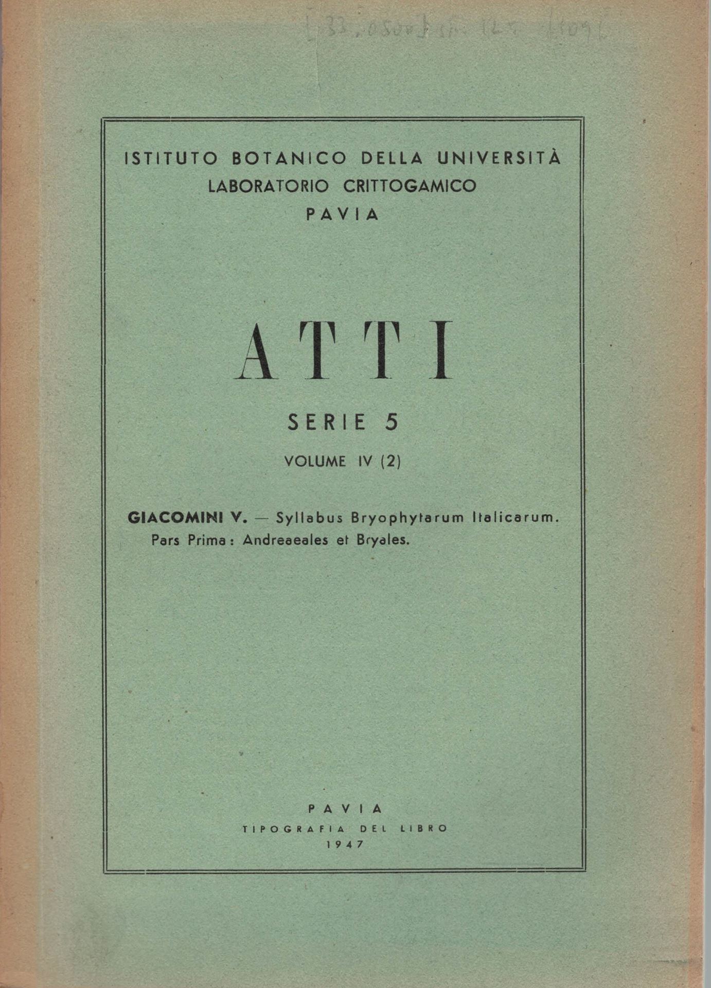 Syllabus Bryophytorum Italicarum. Pars 1: Andreaeales et Bryales. 1947. (Ist. Bot. Univ. Pavia, Lb. Crittogamico, Atti, Serie 5, Volume IV, 2).. 106 p. Paper bd.