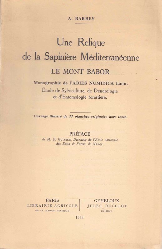 Une Relique de la Sapinière Méditerranéenne.Le Mont Babor. Monographie de l'Abies Numidica Lann. Etude de Sylviculture, de Dendrologie et d'Entomologie forestière. 1934. 33 pls. 82 p. gr8vo. Paper bd.
