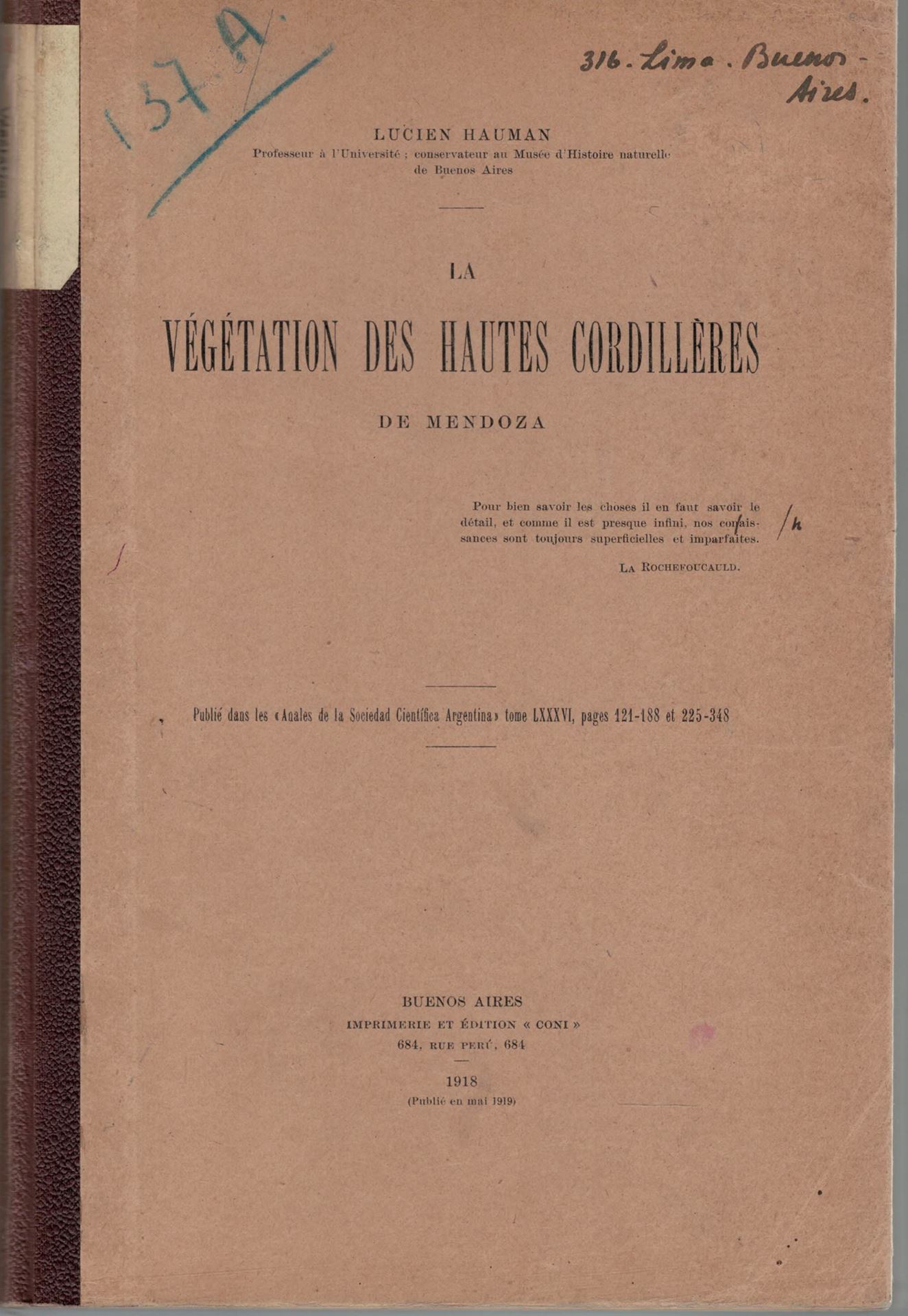 Hauman, Lucien: Végétation des Hautes Cordillères de Mendoza. 1918. (An. Soc. Cient. Argentina, LXXXVI). 194 p. gr8vo. Hardcover. 60.99 (103548)