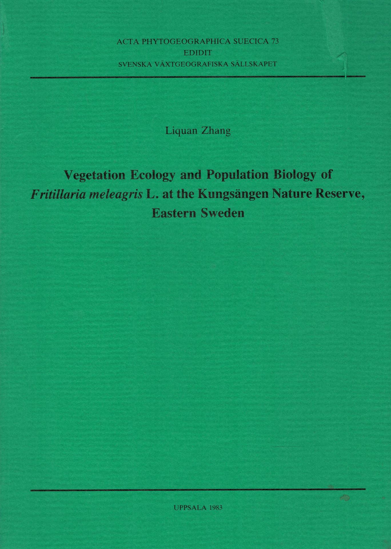 Zhang, Liquan: Vegetation Ecology and Population Biology of Fritillaria meleagris L. at the Kungsängen Nature Reserve, Eastern Sweden. 1983. (Acta Phytogeographica Suecica 73). 27 tabs. 44 figs. 96 p. gr8vo. Paper bd.(83169) 16.05