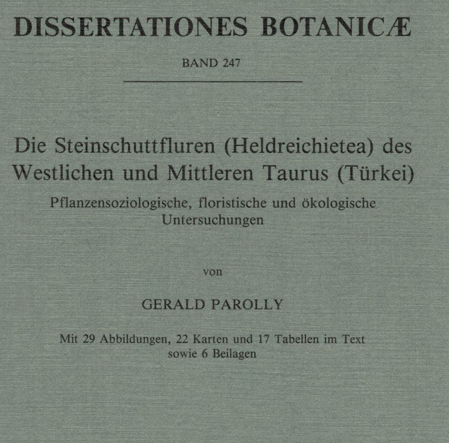 Volume 247: Parolly, Gerald: Die Steinschuttfluren (Heldreichietea) des Westlichen und Mittleren Taurus (Tuerkei). Pflanzensoziologische, floristische und oekologische Untersuchungen. 1995. 29 Abb. 22 Tab. 23 Ktn. X, 374 S. gr8vo. Broschiert.
