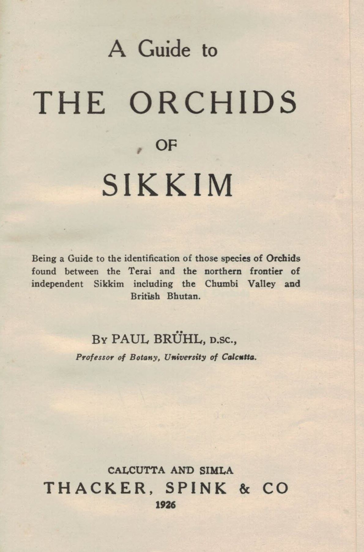 Bruehl, Paul Johannes: A guide to the orchids of Sikkim.Being a Guide to the identification of those species of Orchids found between the Terai and the northern frontier of independent Sikkim including the Chumbi Valley and British Bhutan.1926.1 pl.XVI,208 p.8vo.Cloth. Reprint 1978.(20903) 22.47