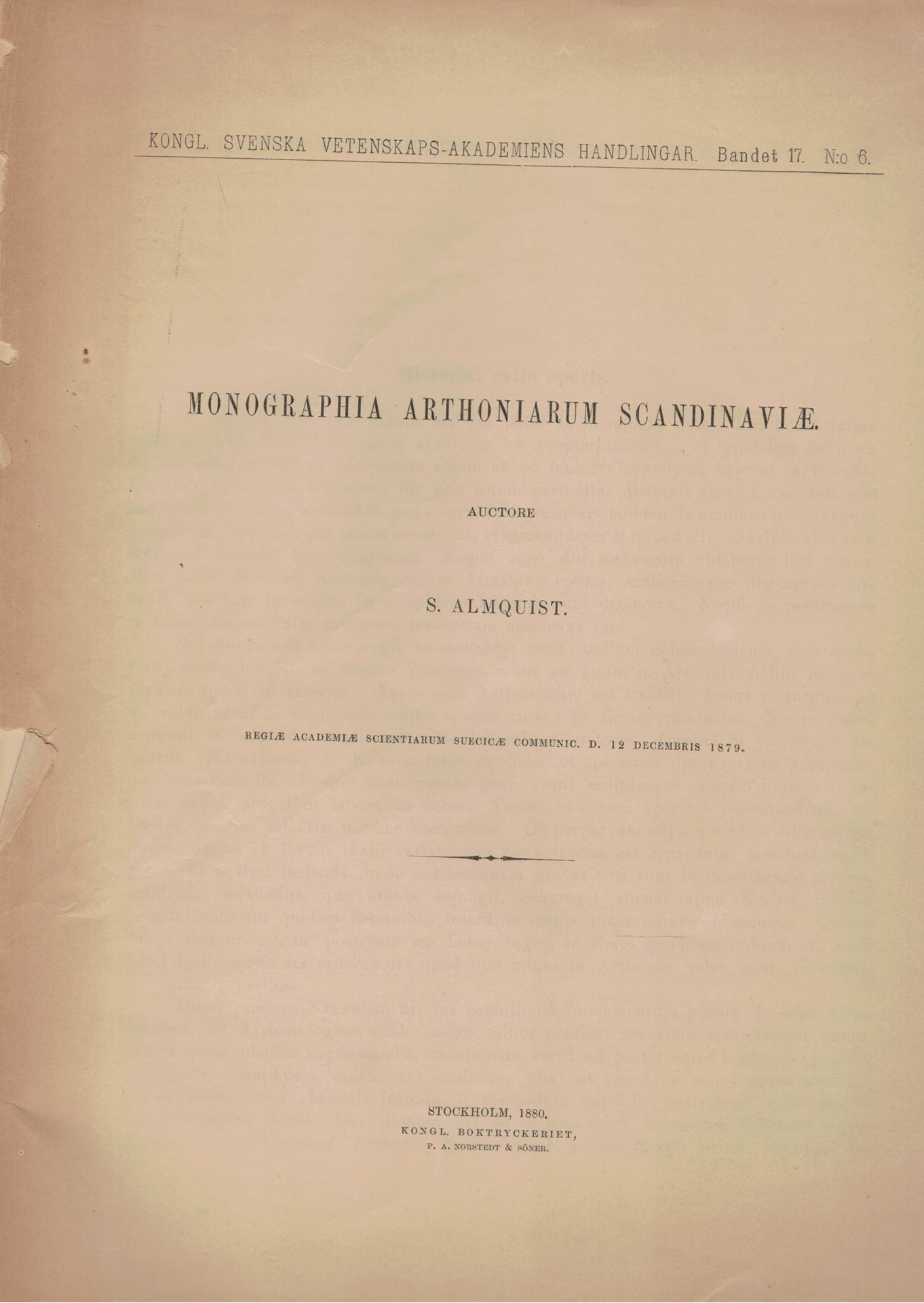 Almquist, S.: Monographia Arthoniarum Scandinaviae. 1880. (Kongl. Svenska Vetenskaps - Ak. Handlingar, 17:6). 69 p. 4to. -Original paper cover. (106547) 38.00