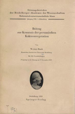 Rauh, Werner: Beitrag zur Kenntnis der peruanischen Kakteenvegetation. 1958. (Sitzungsbereichte der Heidelberger Ak. d. Wissenschaften, Mathematisch - naturwiss. Klasse, Jg. 1958, Abhandlung 1). 234 Fig. 542 S. gr8vo. Broschiert. (107575) 139.00