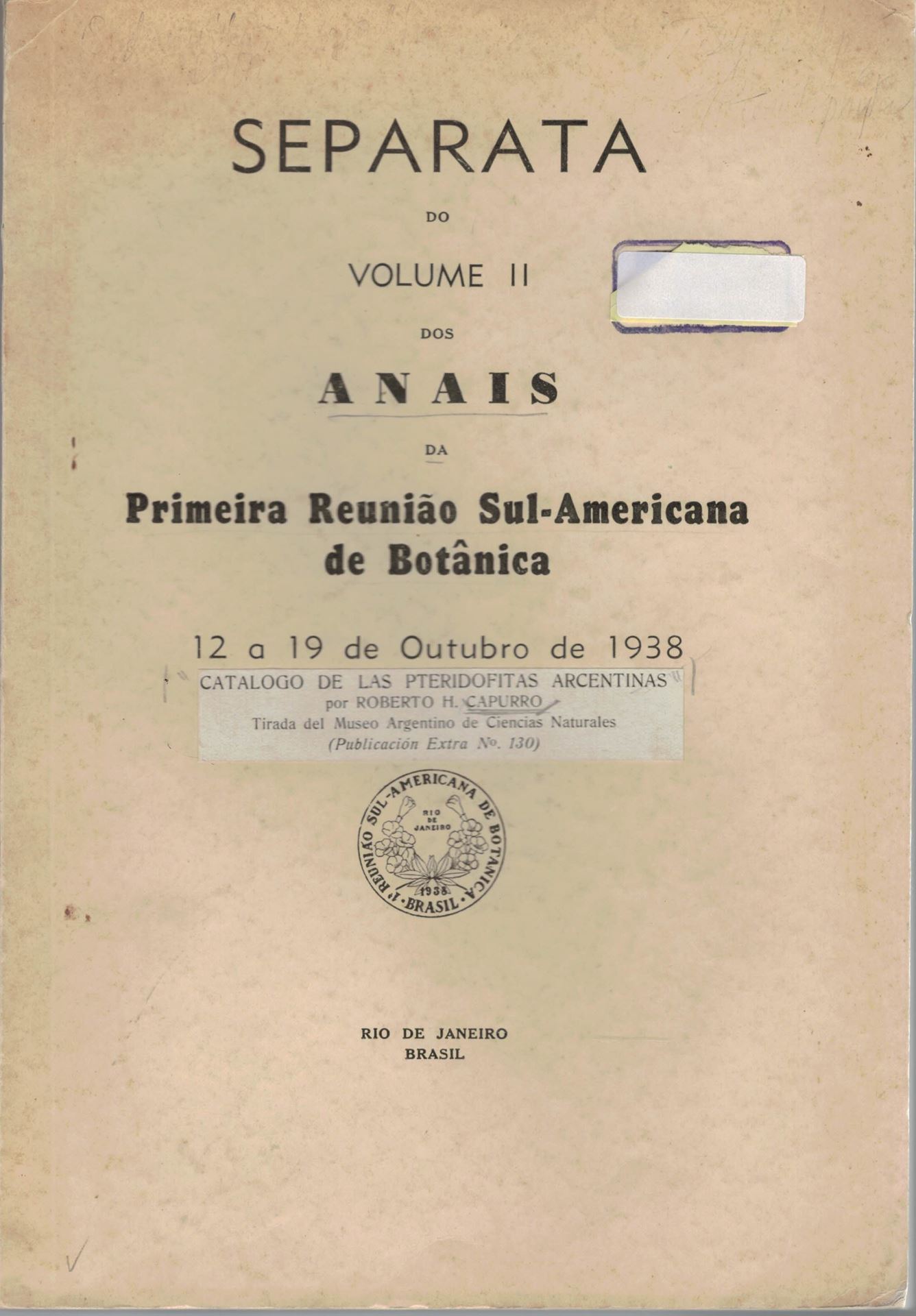 Catalogo de las Pteridofitas Argentinas. 1938. (Anais da Primeira Reuniao Sul-Americana de Botanica..1938/ Mus. Argentino de Ciencias Naturales, Public. Extra,No. 130). 142, VIII p. gr8vo. Paper bd.