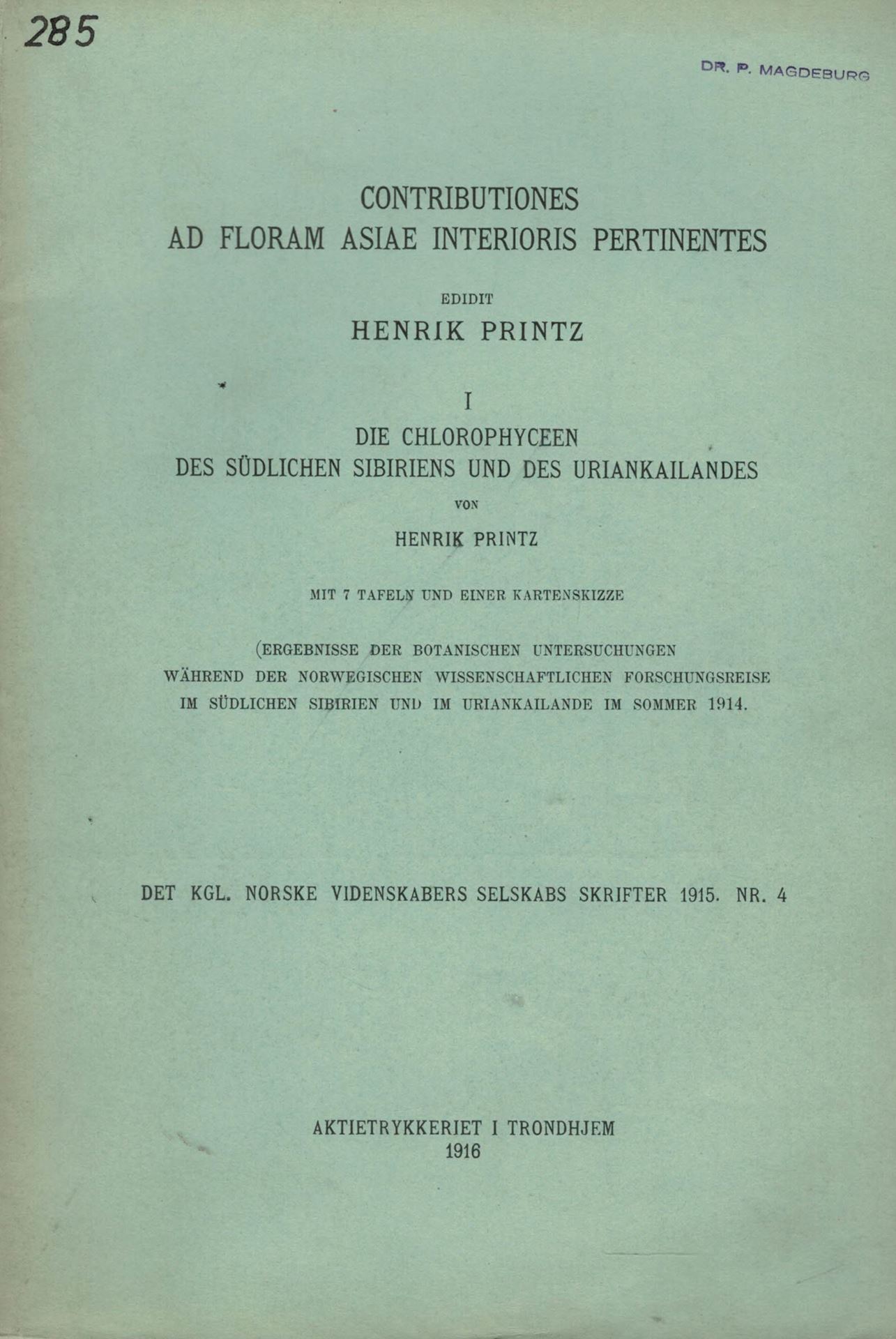 Printz, Henrik: Contributiones ad Floram Asiae Interioris Pertinentes: I: Die Chlorophyceen des südlichen Sibiriens und Uriankai- landes. 1916. (Kongl. Norske Vedensk. Sesk. Skrifter,1915:4). 7 Taf. XXVII, 52 S. Broschiert. (87885) 24.00