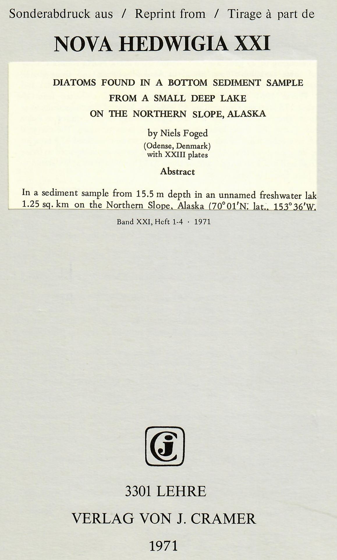 Foged, Niels: Diatoms found in a bottom sediment sample from a small deep lake on the Northern Slope, Alaska.1971.(Nova Hedwigia,Vol.21, partim). 23 plates. 114 p. gr8vo.Paper bd.(62562) 26.00 (ISBN 978-3-7682-0824-6 )