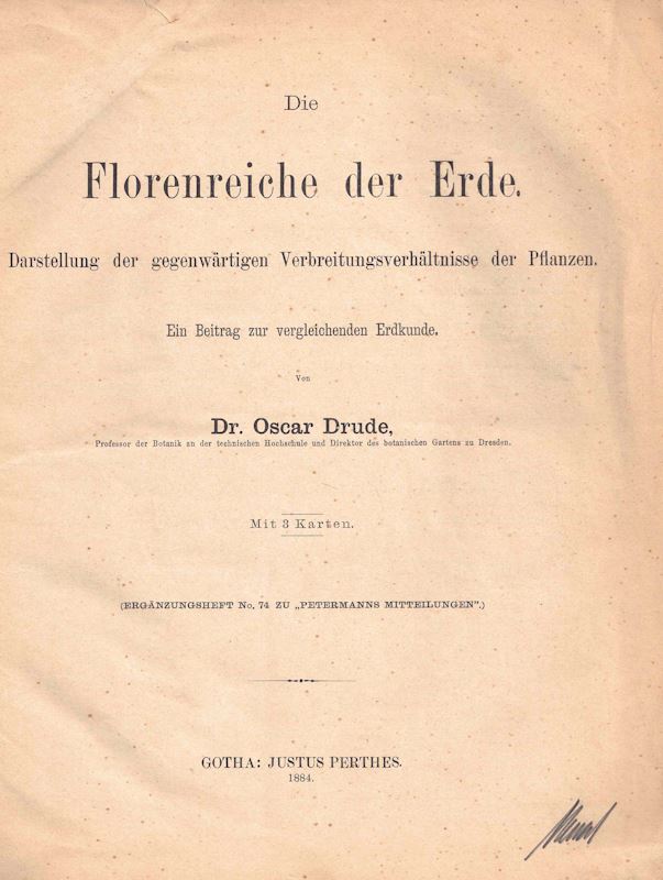 Drude, Oscar: Die Florenreiche der Erde. Darstellung der gegenwärtigenVerbreitungsverhältnisse der Pflanzen. 1884. 3 gef. farbige Karten.74 S. 4to. Leinen. (87252) 52.00