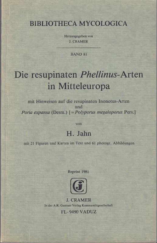 JAHN, Hermann: Die resupinaten Phellinus-Arten in Mitteleuropa, mitHinweisen auf die resupinaten Inonotus-Arten und Poria expansa (Desm.)(= Polyporus megaloporus Pers.). 1966-1967. (Westfaelische Pilzbriefe,VI). Reprint 1981. (Bibliotheca Mycologica, 81). 21 Fig. 61 Photogr.IV,116 S. gr8vo. Brosch. (5907) 24.00(ISBN 3-7682-1307-2)