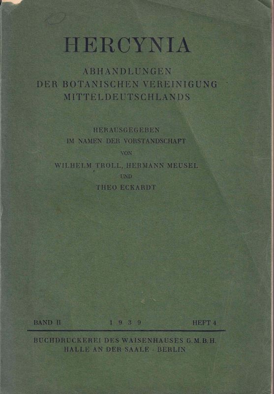 MEUSEL, Hermann: Die Vegetationsverhaeltnisse der Gipsberge im Kyff-haeuser und im suedlichen Harzvorland. Ein Beitrag zur Steppenheide-frage. 1939. (Hercynia, Abh.Bot.Ver.Mitteldeutschl., Bd. 2, Heft 4).34 Taf. 56 Abb. 21 Verbreitungskarten. 2 Vegetationskarten. 372 S. gr8vo. Broschiert. (23291) 68.00