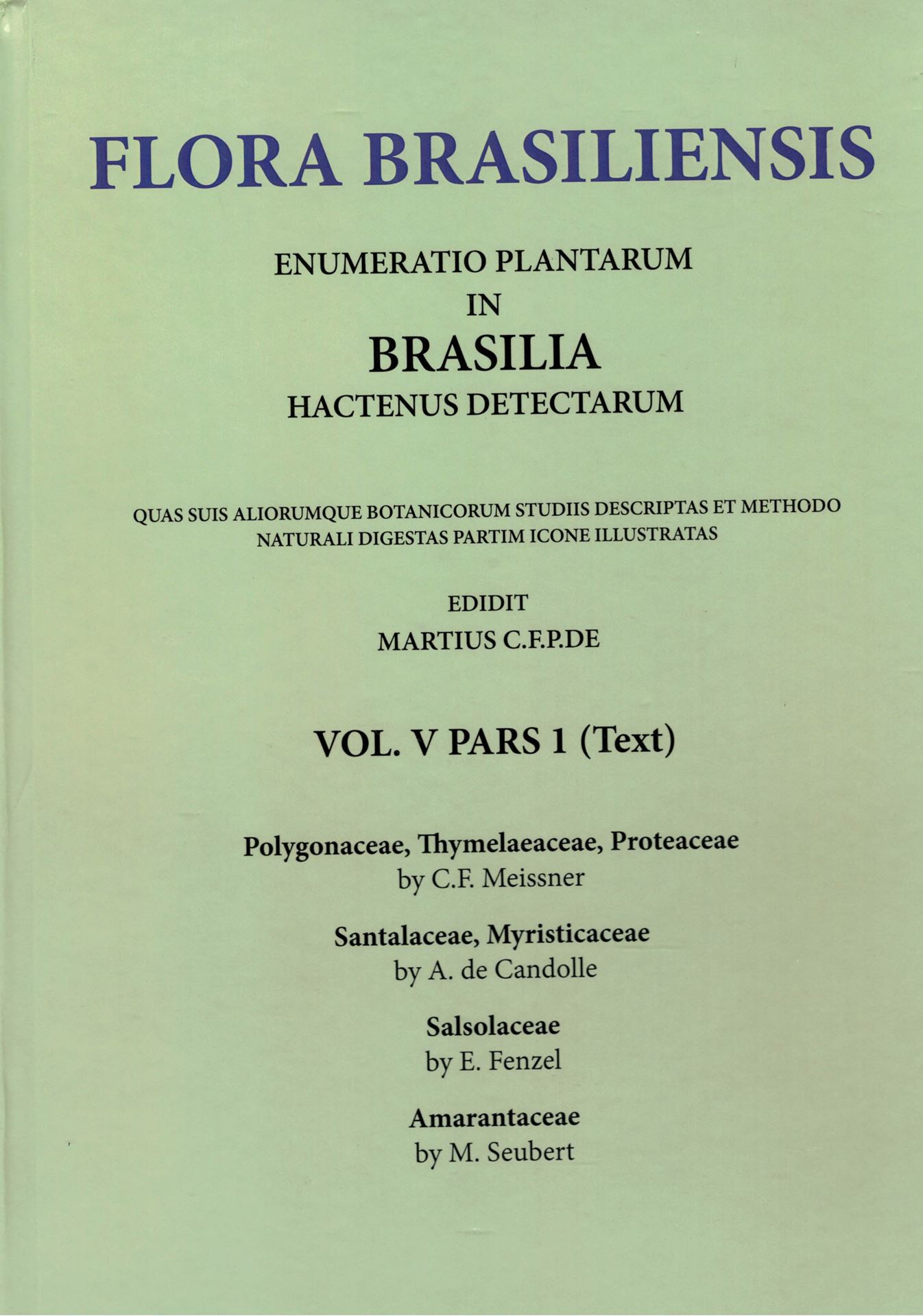 Flora Brasliensis: Ed. by C. F. P. von Martius, A.G. Eichler & I. Urban: Volume 05:01: Meissner, C. F.: Polygonaceae, Thymelaeaceae, Proteaceae, Candolle A.de: Santalalaceae, Myristicaceae, Fenzl,E.: Salsolaceae, Seubert, M.: Amaranthaceae. 1855 -1875. (Reprint 2001). 75 plates. 264 p. Paper bd. in 2 volumes (text & plates). (80307) 55.64
