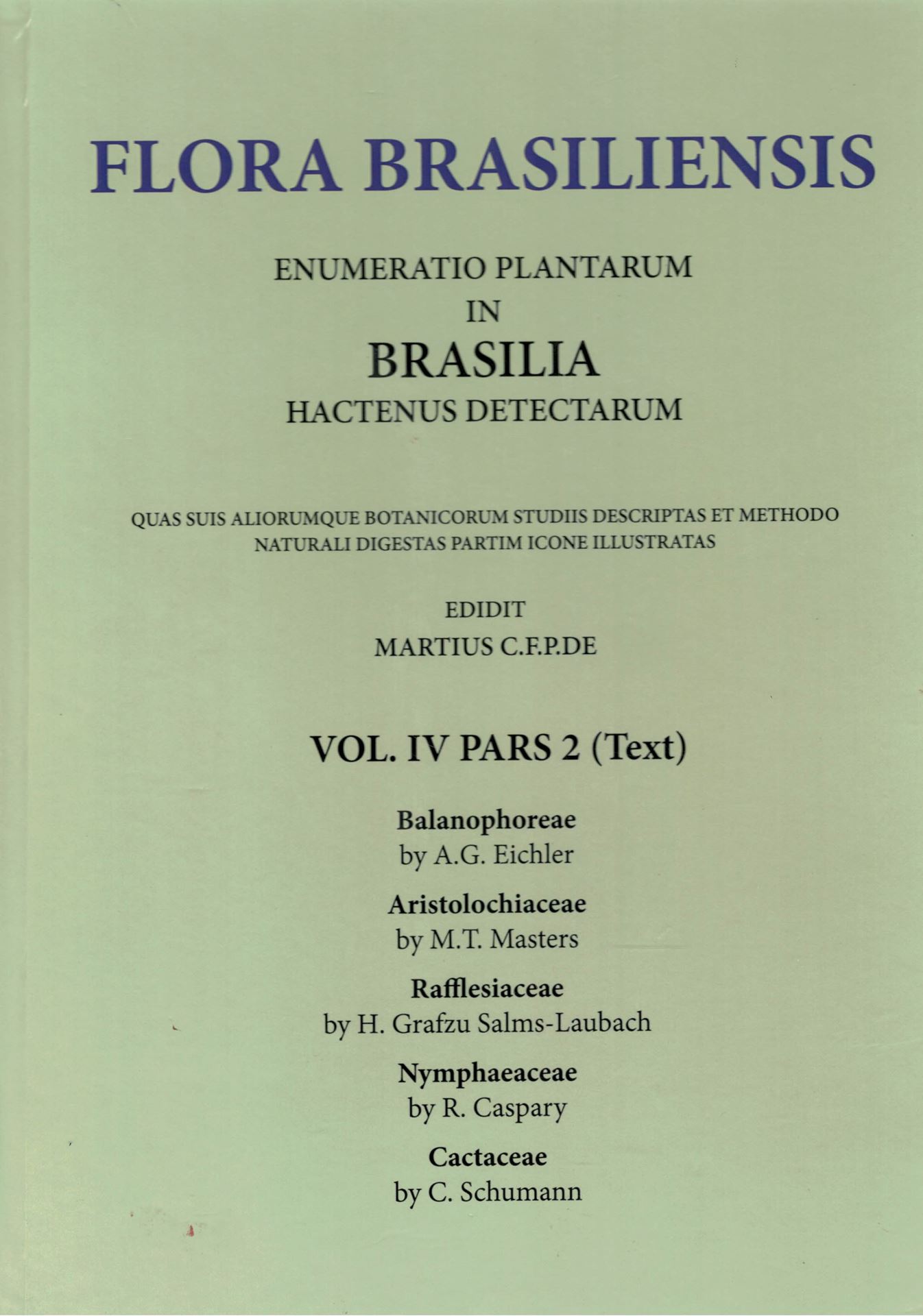 FLORA BRASILIENSIS: Ed. by C.F.P.Martius, A.G.Eichler and I.Urban. Volume 04:02: A.G.Eichler: Balanophoreae/ M.T.Masters: Aristolochiaceae/ H. Solms-Laubach: Rafflesiaceae/ R.Caspary: Nymphaeaceae/ C.Schumann: Cactaceae. 1869 - 1890. (Reprint 2002). 63 plates. 334 p. Paper bd. (28465) 56.71