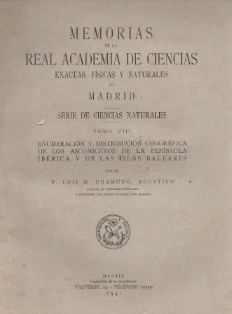 Enumeracion y distribucion geografica de los Ascomi- cetos de la peninsula iberica y de las islas baleares. 1941. (Mem. Real Ac.Cienc.Ex., Ser.Cienc.Natur.,8). 403 p. gr8vo. Paper bd.