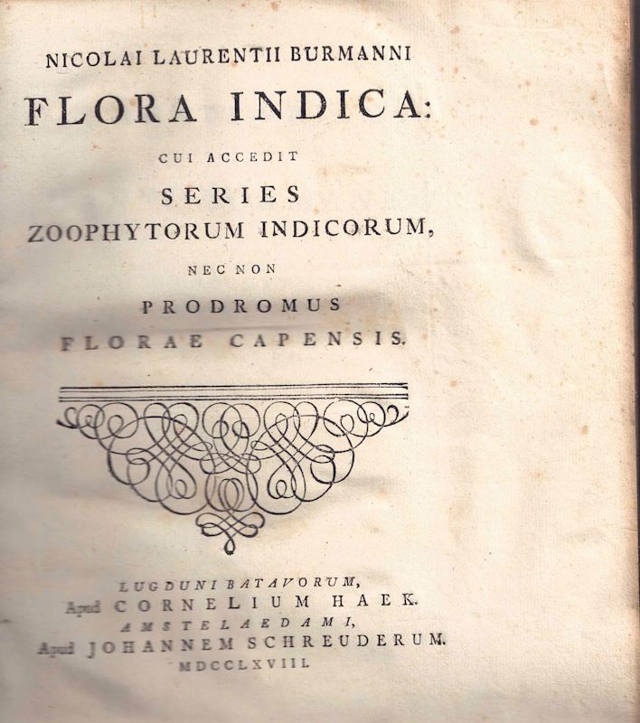 Flora Indica CuiAccedit Series Zoophytorum Indicorum nec non Prodromus Florae Capensis. Lugduni Batavorum 1768 (Apud Cornelium Haek; Amstedmai, Johannem Schreuderum). 67 engraved plates (uncoulered). 241 p. & 28 p. Index.