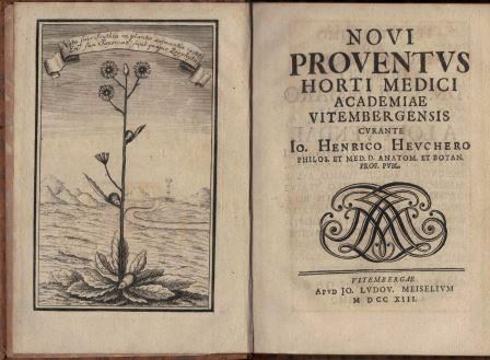 Novi Proventus Horti Medici Academiae Vitembergesnis curante Io. Henrico Heuchero. 1713. 1 plate. VI,90, VI p. 8vo. Leather.