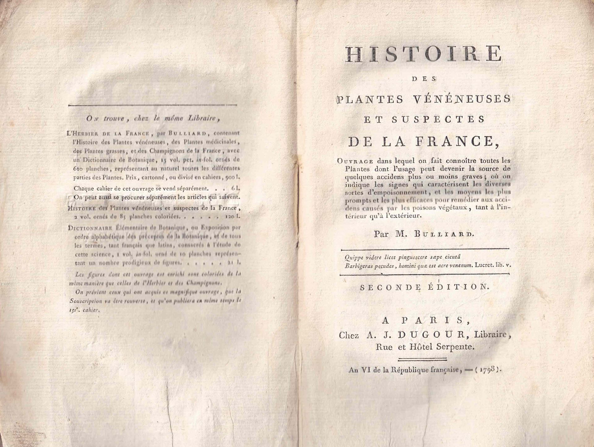 Histoire de Plantes Vénéneuses et Suspectes de la France. Ouvrage dans laquelle on fait connoitre toutes les Plantes dans l'usage peu devenir la source de quelques accidens plus ou moins graves; ou on indique les lsignes qui caractérisent les diverses sortes d'Empoissonnement, et les moyens les plus prompts et les plus efficaces pour remédier aux accidens causé par les poisons végétaux...