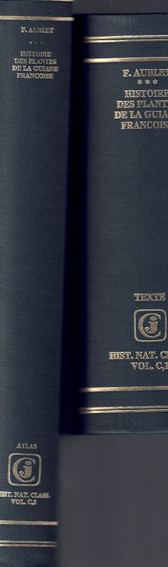 Aublet, J.B.C.F.: Histoire des Plantes de la Guiane Francoise.P. 1775.(Reprint 1977).Text in octavo,atlas in quarto.4 volumes bound in 2.IV,1228 pages.392 plates.Cloth bound.(Historiae naturalis classica,100)(88464) 224.70(ISBN 3-7682-1105-3)