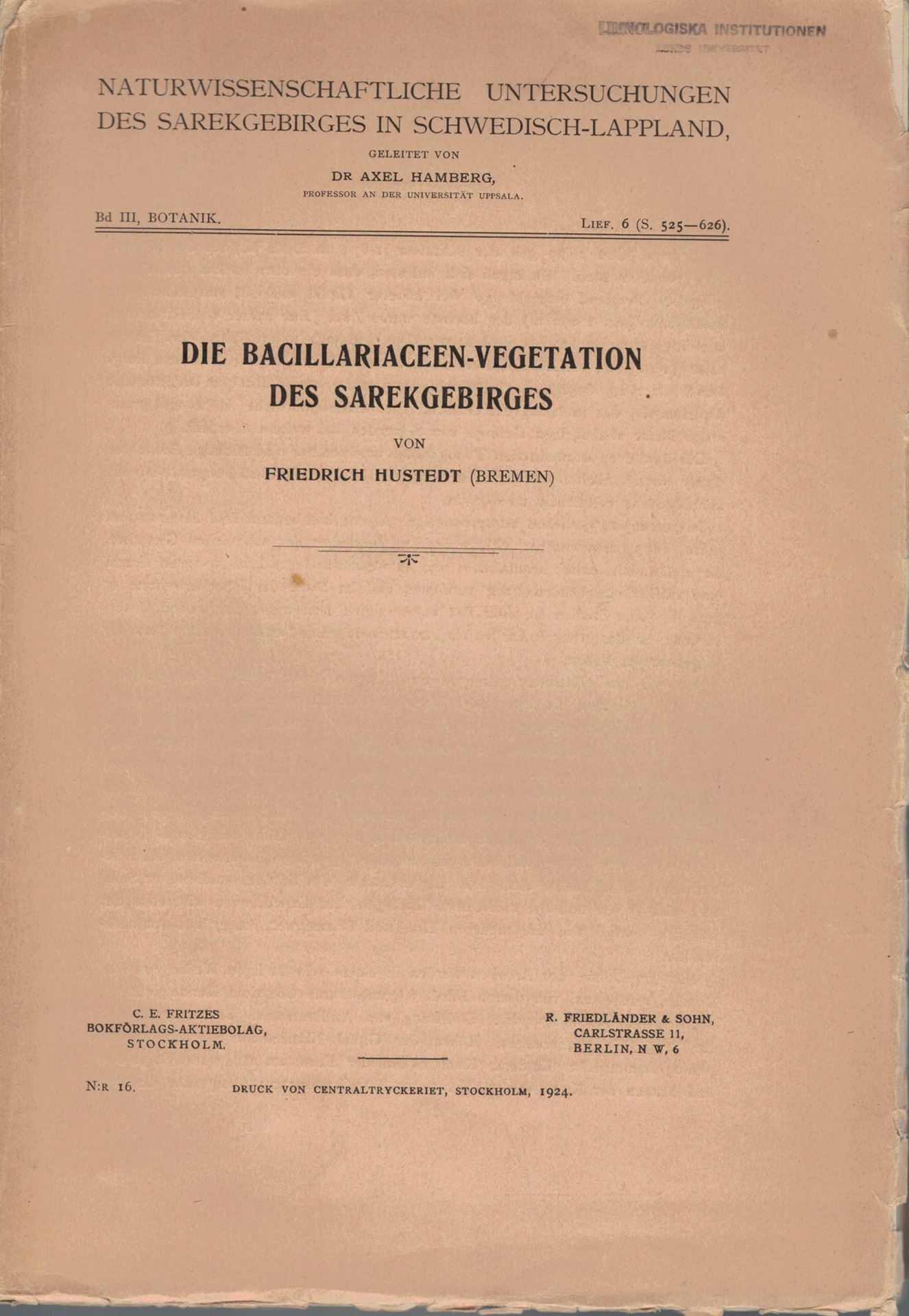 Hustedt, Friedrich: Die Bacillariaceen - Vegetation des Sarekgebietes.1924. (Naturwiss. Untersuchungen des Sarekgebietes in Schwedisch -Lappland, Band III:Botanik, Lfg. 6). 22 Tafeln. 101 S. gr8vo.Broschiert. (102575) 51.36