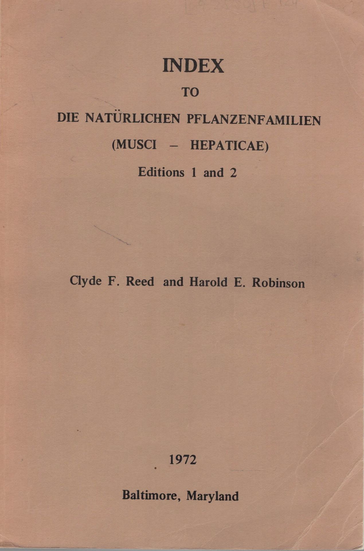 REED, Clyde F. and Harold E.ROBINSON: Index to "Die Natuerlichen Pflanzenfamilien (Musci-Hepaticae)". Editions 1 and 2. 1972. (Contrib. Reed Herbarium, 21). XXII,336 p. gr8vo. Paper bd. (21401) 39.00