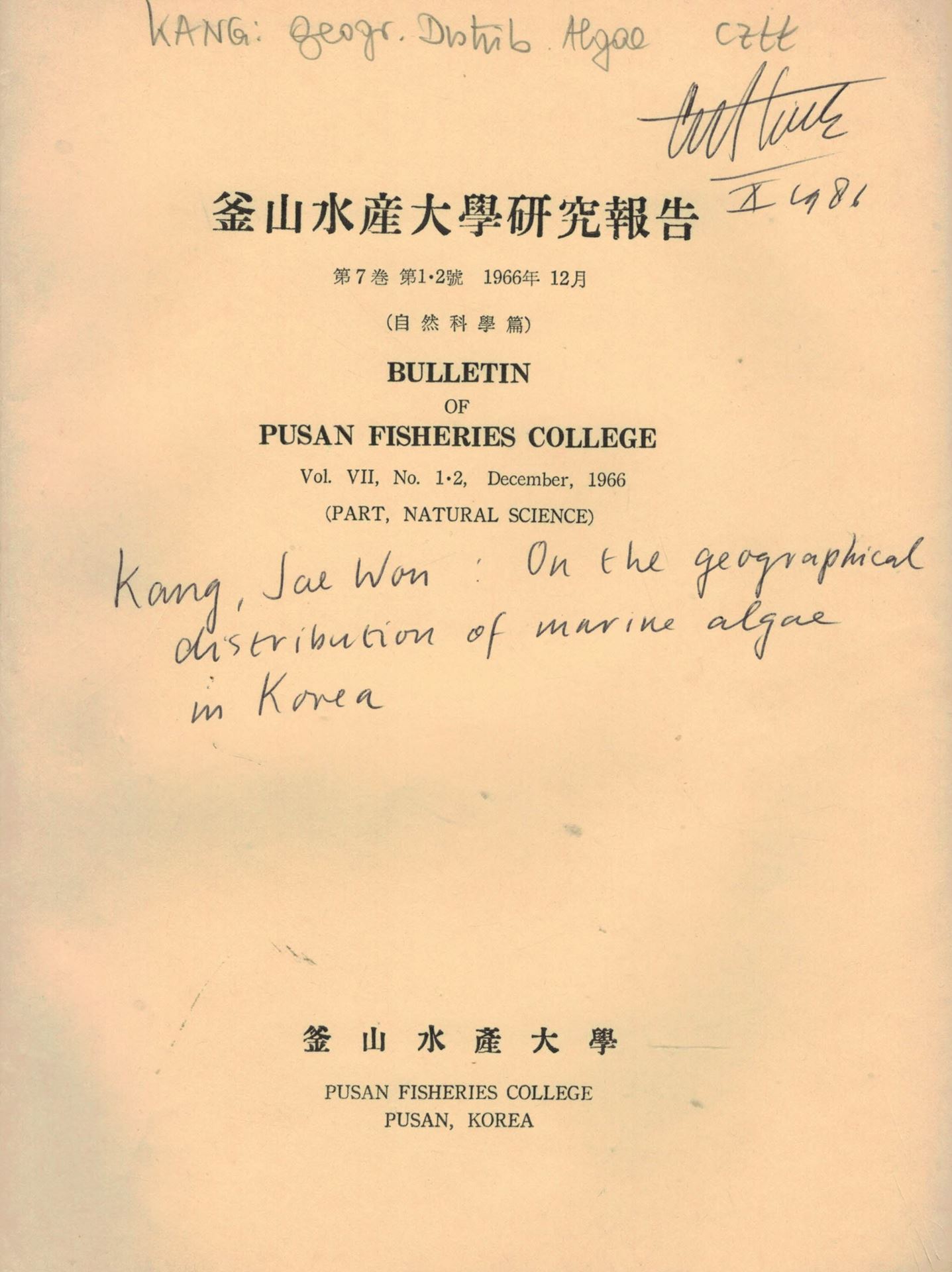 On the geographical distribution of Marine Algae in Korea. 1966. (Bulletin of Pusan Fisheries College, Vol. VII:1-2). 12 plates. 125 p. gr8vo. Paper bd. - In English.