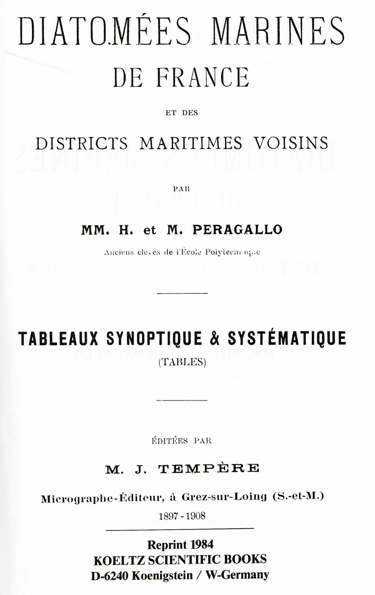 Peragallo,Hippolyte et Maurice: Les Diatomees marines de France et des districts maritimes voisins.1897-1908.138 planches.552 p.gr8vo.Cloth. Reprint 1984. (18037) 179.00 (ISBN 978-3-87429-219-1)