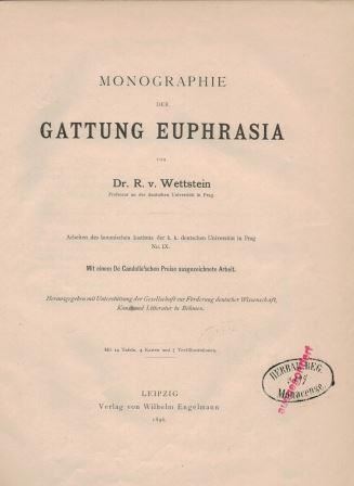 Monographie der Gattung Euphrasia. 1896. (Arbeiten des botanischen Instituts der. k.k. deutschen Universität in Prag, band 9). 14 Taf. 4 Karten. 7 Fig. 316 S. 4to. Hardcover.