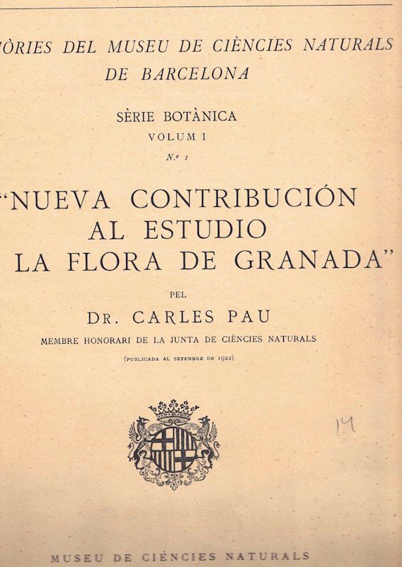 PAU, Carlos: Nueva Contribucion al Estudio de la Flora de Granada. 1922.(Memorias del Museu de Ciencias Naturales de Barcelona, Serie Botanica,Vol. I:1). 10 plates. 74 p. Folio. Paper bd. (20280) 34.00