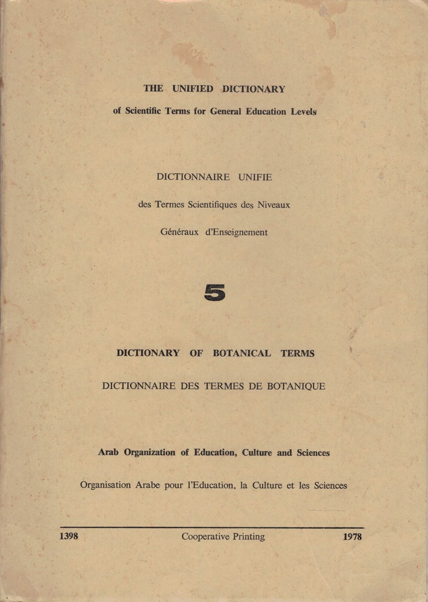 of scientific Terms for General Education Levels. Volume 5: Dictionary of Botanical Terms. Ed. by Arab Organization ofEducation, Culture and Scinces. 1978. approx. 400 p. with Arabian pagination. gr8vo. Paper bd. - Trilingual (Arabian, English , French).