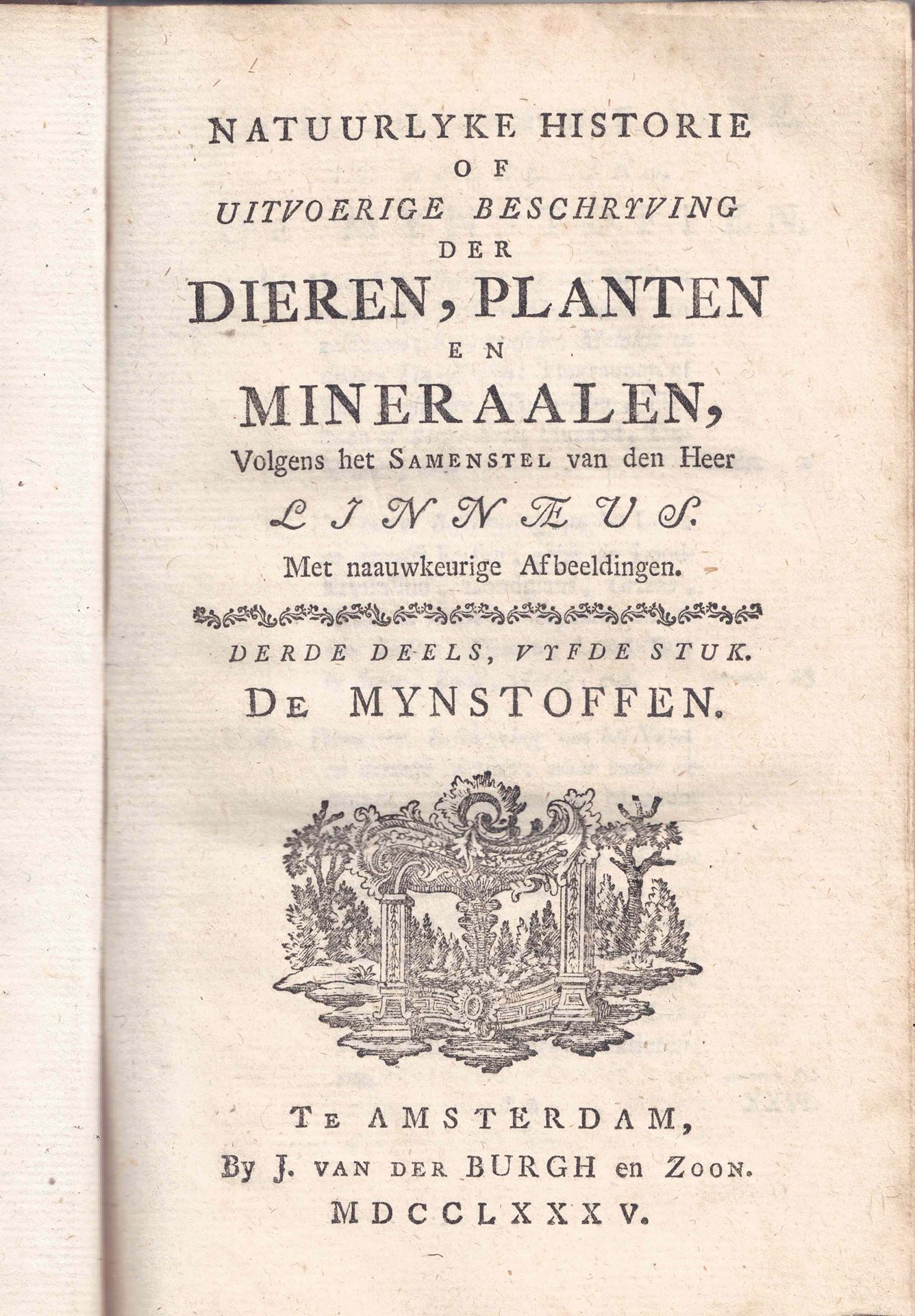 Natuurlyke Historie Of Uitvoerige Beschrivning der Dieren, Planten en Mineraalen Volgens het Samenstel van den Heer Linnaeus Mt naauwkeurige Afbeeldingen. Deerde Deels, Vyfde Stuk. 1785. 6 folding. copper plates, 360 p. Halfleather.- (Bound with:) Systematische Bladwyzer der Planten... & several indexes (unpaginated, ca. 100 p.).