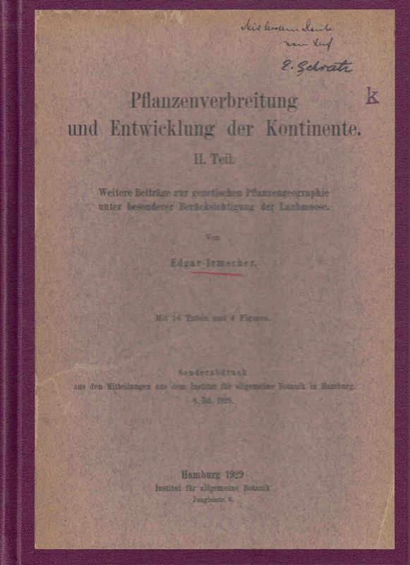 Pflanzenverbreitung und Entwicklung der Kontinente. Teil 2: Weitere Beträge zur genetischen Pflanzengeographie unter besonderer Berücksichtigung der Laubmoose. 1929. (Mitteilungen aus d. Inst.f.allgem.Bot. Hamburg, 8). 4 Fig. 16 Tafeln. 374 S. gr8vo. Leinen.