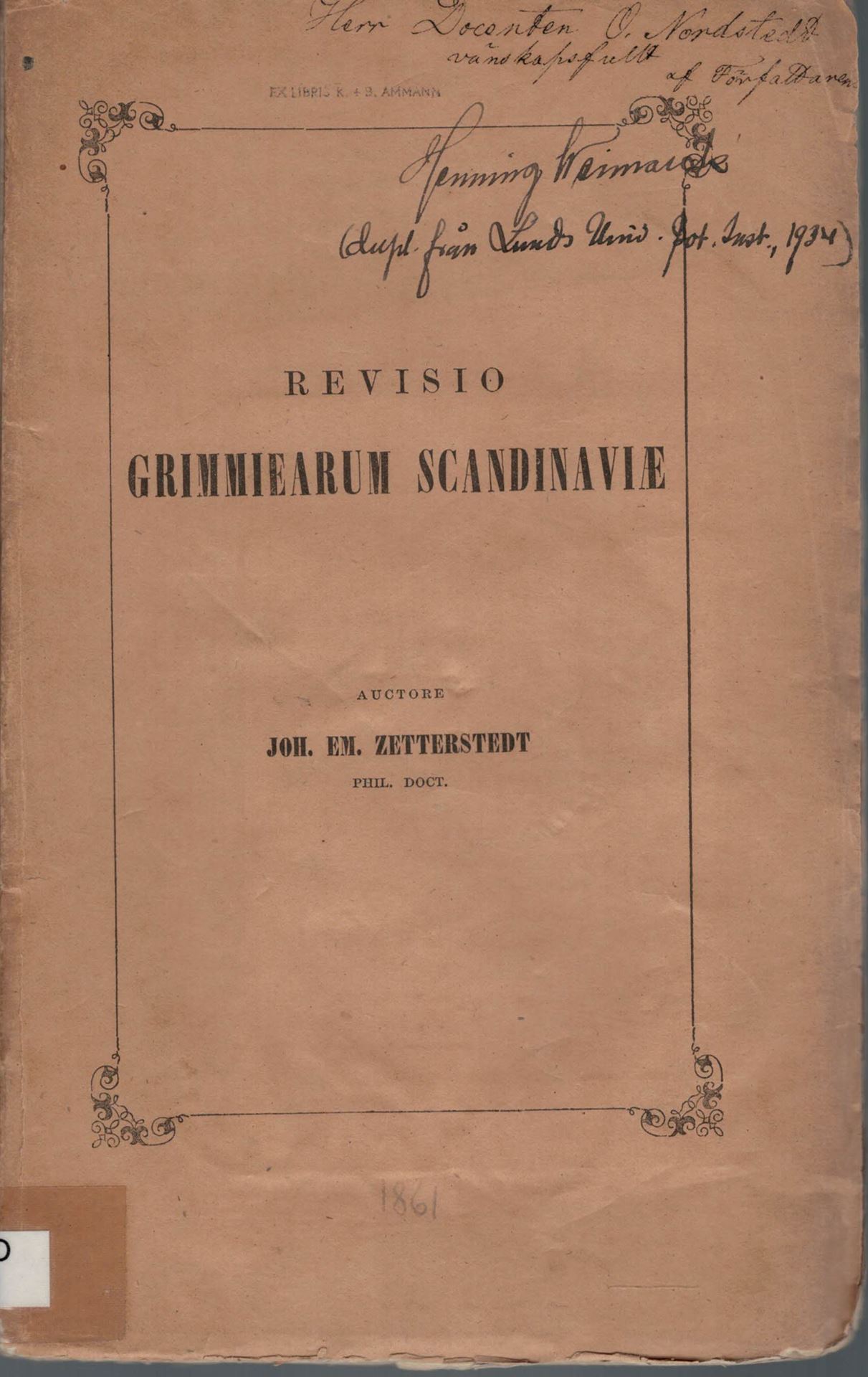 Revisio Grimmiearum Scandinaviae. 1861. 139 & VI p. Paper bd.