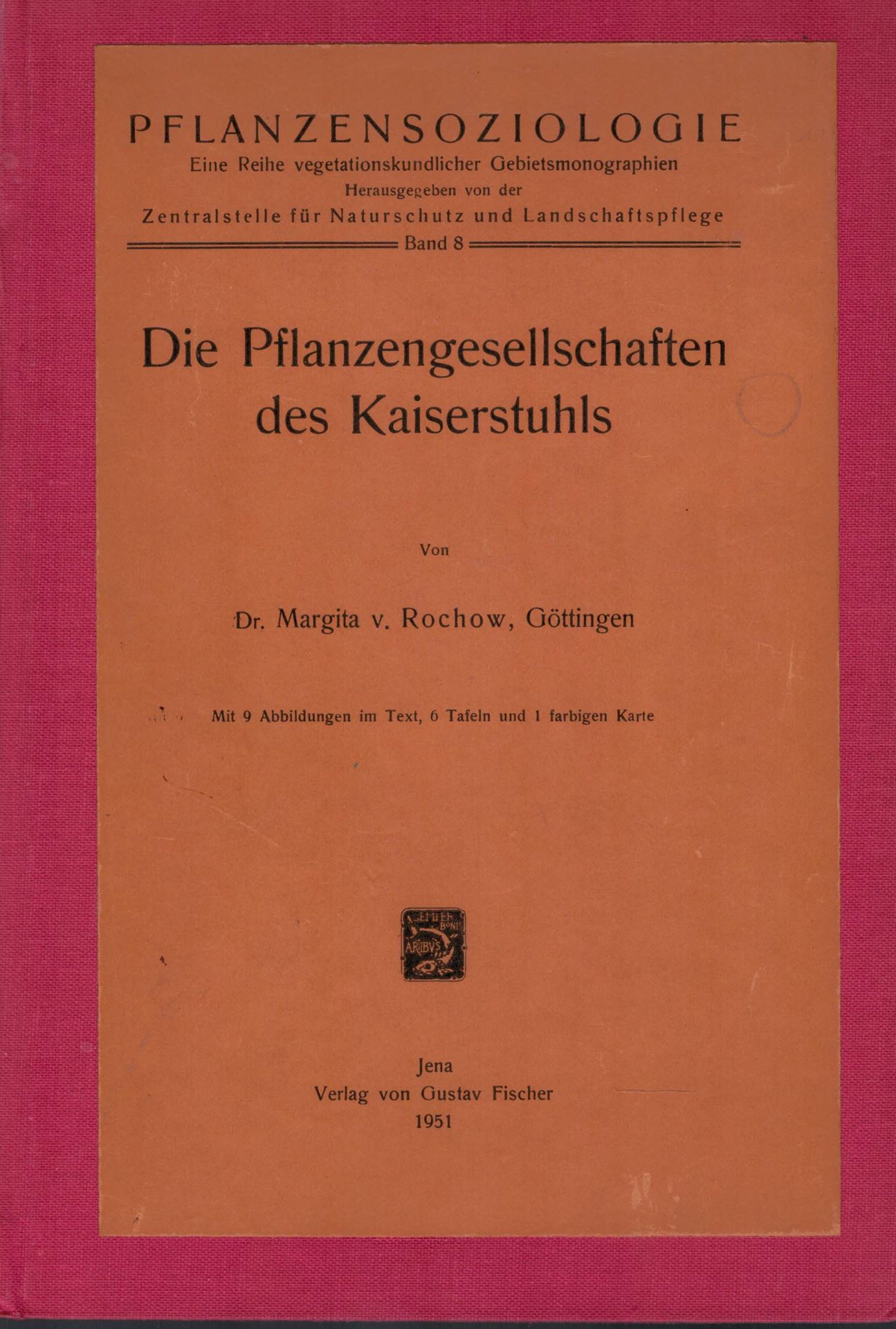 Rochow, Margita von: Die Pflanzengesellschaften des Kaiserstuhls. 1951.(Pflanzensoziologie.Eine Reihe vegetationskundlicher Gebietsmono-graphien,Bd.8). 9 Abb. 6 Tafeln. 1 Faltkarte (Vegetationskarte desKaiserstuhls 1.25.000). 140 S. -Gebunden mit: Sleumer, Hermann: DiePflanzenwelt des Kaiserstuhls. 1934. (Repertorium specierum nov. regnivegetabilis, Beiheft 77). 170 S. gr8vo. Leinen. (58085) 67.00
