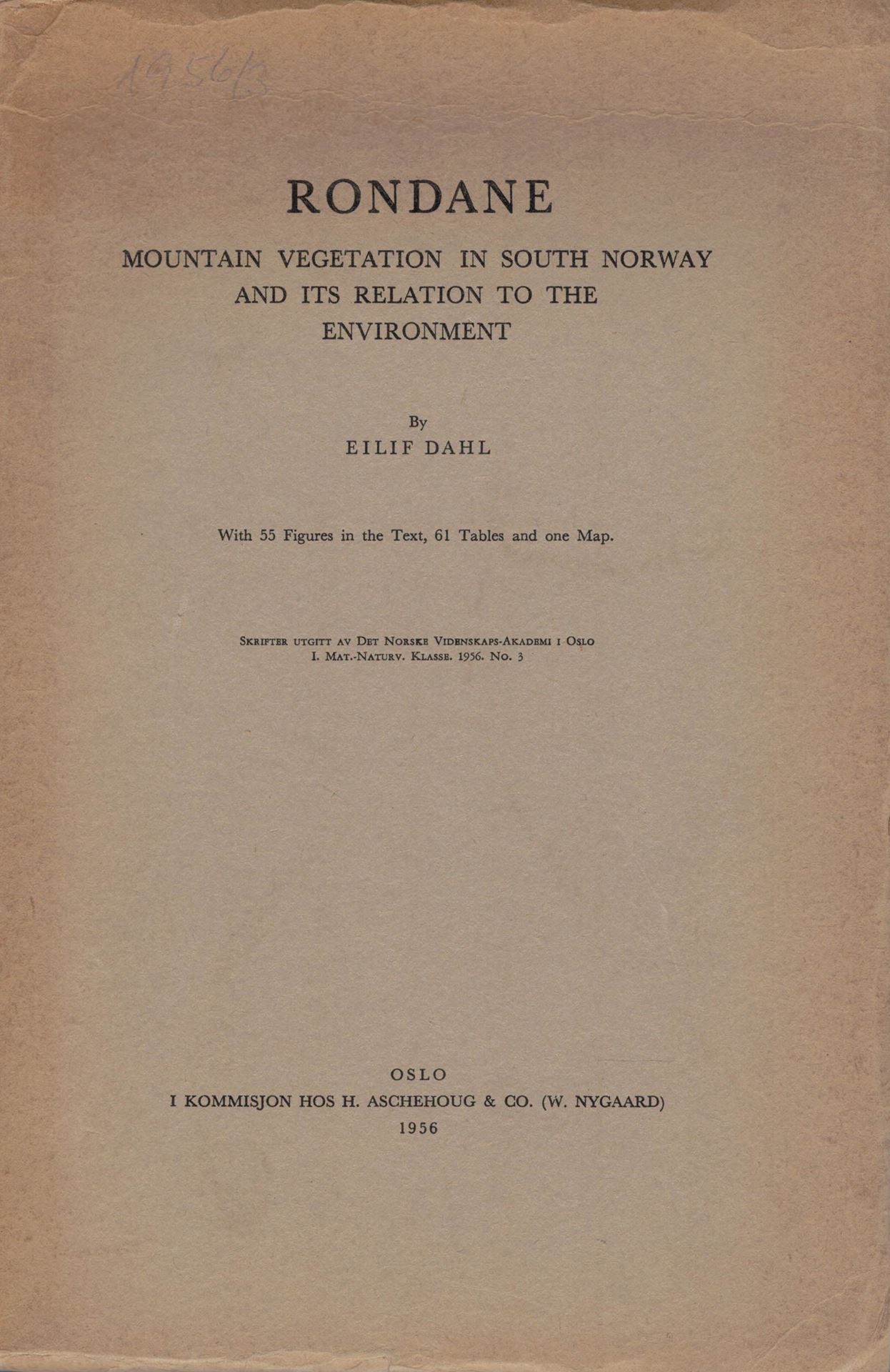 Dahl,Eilif: Rondane.Mountain Vegetation in South Norway and its Relation to the Environment.1956.(Skrifter utgitt av det Norske Vidensk.- Akademi i Oslo,I:Mat.-Naturv.Klasse,1956:3).1 foldg.map.Illus.374 p. gr8vo.Paper bd.-Rare. (24176) 93.09