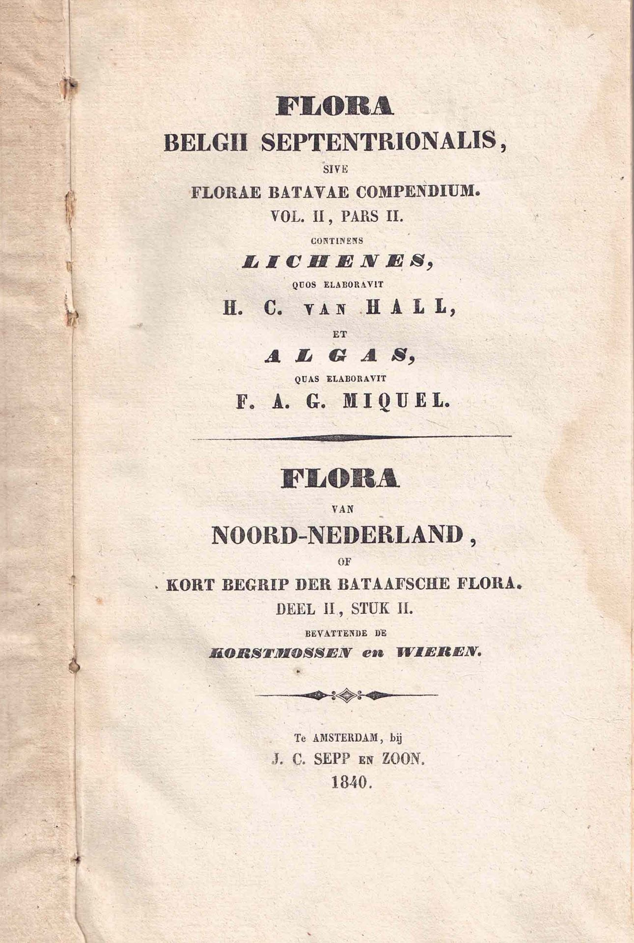 sive Florae Batavae Compendium. Volume II, Pars 2. Continens Lichenes quos Elaboravit H. C. van Hall et Algas quas Elaboravit F. A.G. Miquel. 1804. XI, 477, Index VI p. Modern halfcloth.
