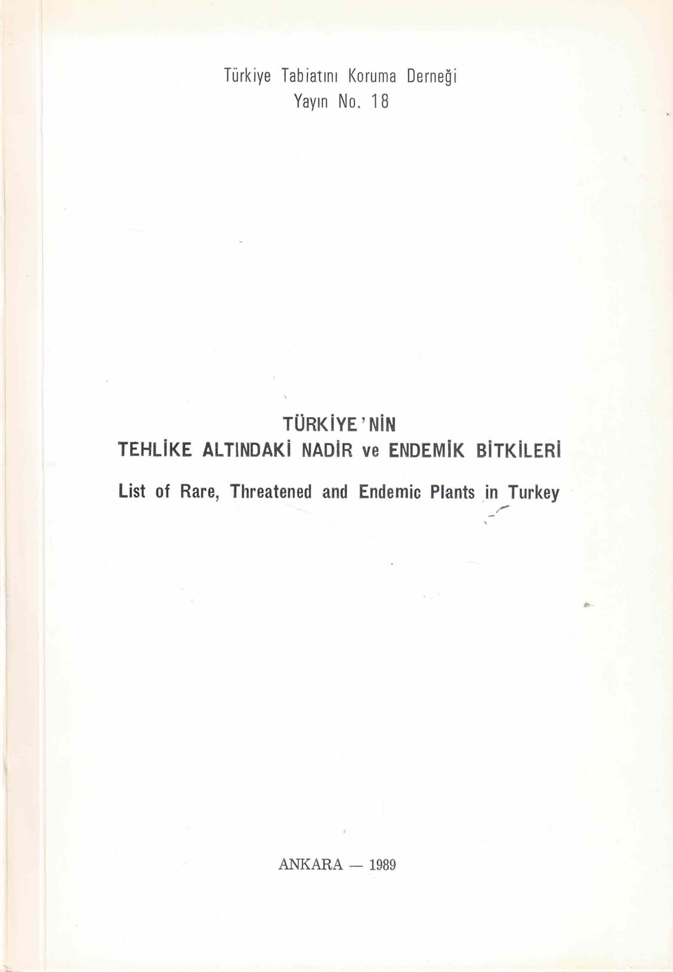 tehlike altindaki nadir ve endemik bitki türleri: IUCN Red Data book kategorilerine Hazirlamistir ( List of rare and threatened plants in Turkey. 1989. (Türkiye Tabiatini Koruma Dernegi,18). 227 p. gr8vo. Paper bd.- In Turkish, with English summary.